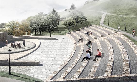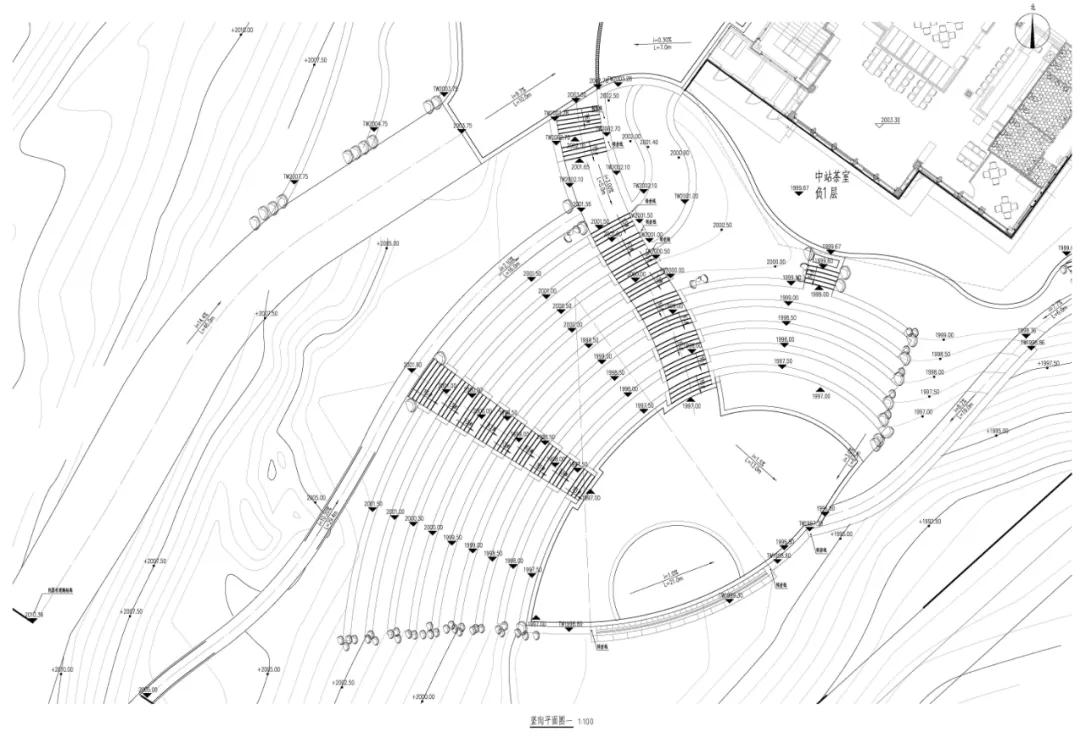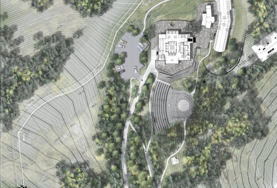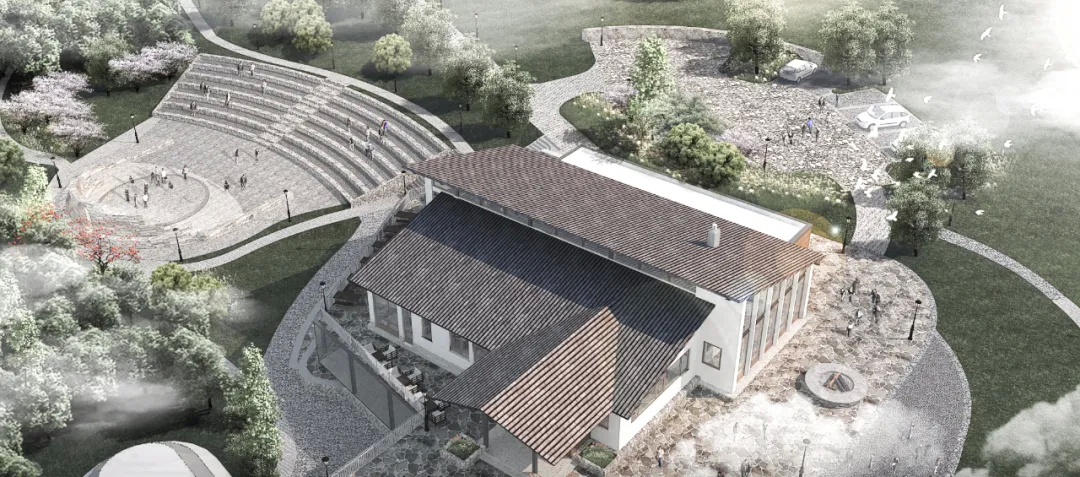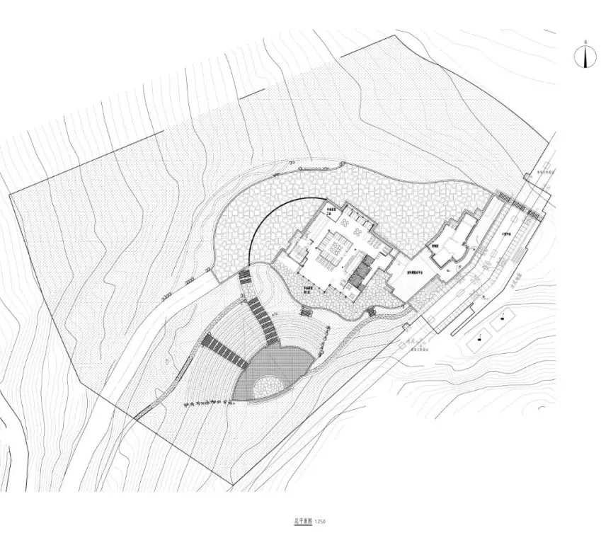 圓弧具有向心的力量 。無(wú)論是作為表演場(chǎng)所還是活動(dòng)舞臺(tái),圓弧形的空間都能把視線(xiàn)聚焦在一點(diǎn)。而劇場(chǎng)的階梯型空間背靠山體順勢(shì)而為,用景觀手法把環(huán)境的挑戰(zhàn)化為機(jī)遇,在廣闊的山脊間自然而然形成聚集的空間關(guān)系。