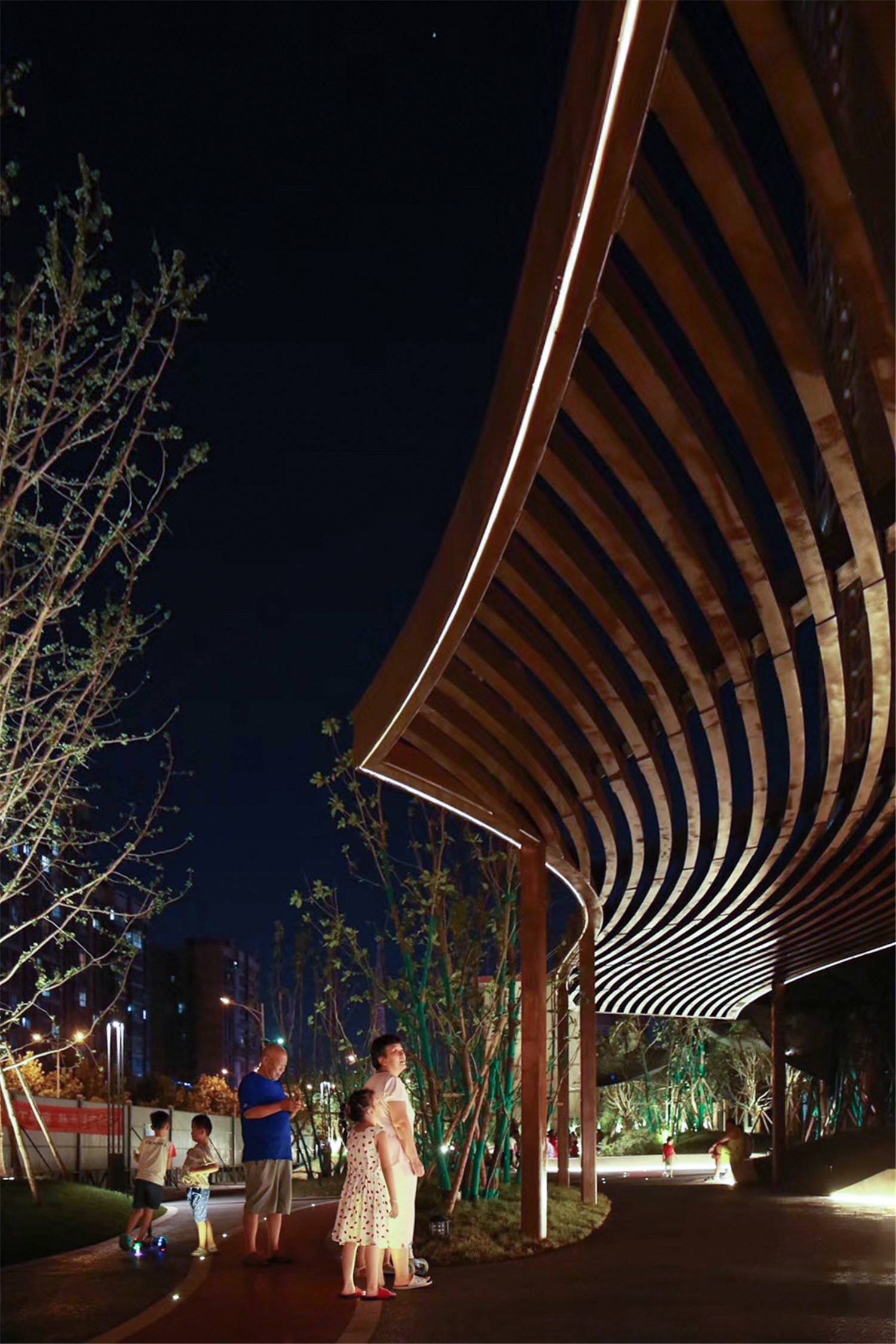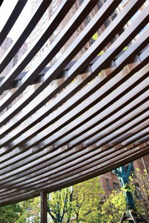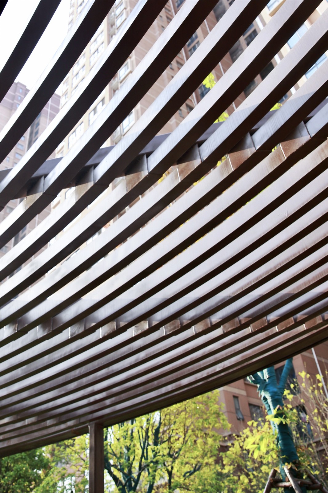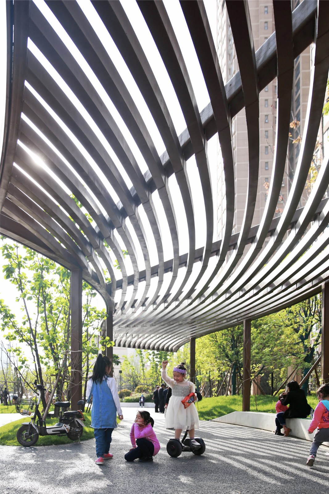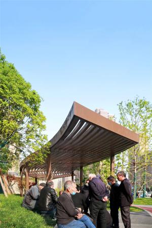廊架設(shè)計(jì)與本次口袋公園名稱“紅旗公園”相契合,模擬旗幟迎風(fēng)招展的動(dòng)態(tài)效果,并形成場(chǎng)所空間——“展旗廊”。在項(xiàng)目建成后的回訪中我們發(fā)現(xiàn),“展旗廊”的使用率極高,周邊也被居民自發(fā)的重載了許多新的活動(dòng)模式,原本廢棄的場(chǎng)地活動(dòng)密度大幅增加,人群溝通的活力與氛圍得到極大改善。過(guò)去被不便于使用的街區(qū)空間阻斷的社區(qū)文化與歸屬感正在重新建立。