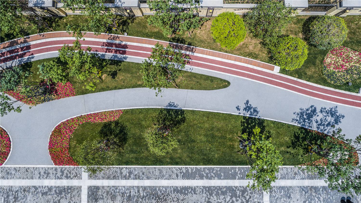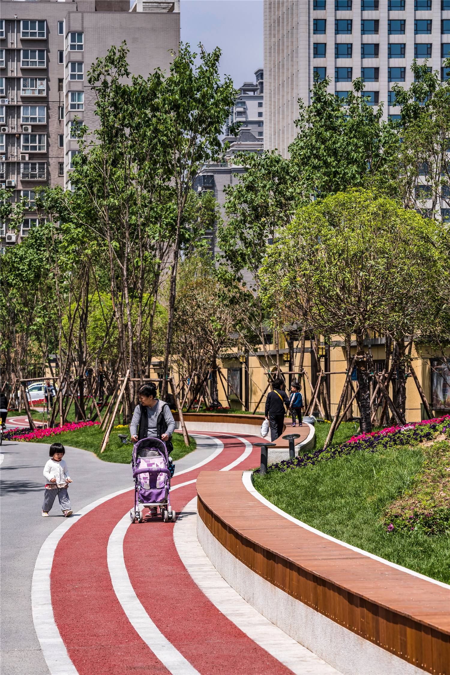 于是,在設(shè)計(jì)之初,團(tuán)隊(duì)通過(guò)研究片區(qū)服務(wù)功能及周邊人群使用動(dòng)線,重新梳理場(chǎng)地,挖掘城市肌理的可塑性,打破傳統(tǒng)單一、線性的構(gòu)圖,用曲線重組帶狀空間的格局界限,慢跑道豐富內(nèi)部色彩,提升活力。