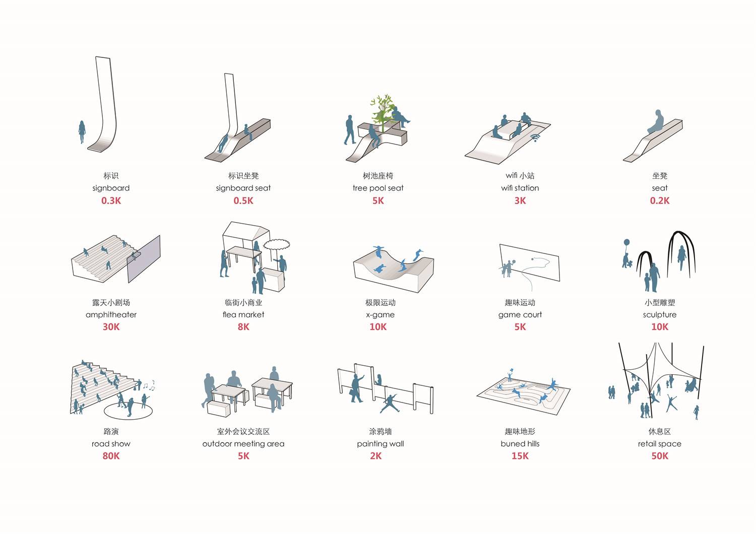 1K≈10平方米。以K為單位,將各種不同活動賦予場地,梳理公共空間活動形式,根據(jù)基本單位K值換算不同功能空間的占地面積,合理布控置入,形成多元豐富的城市廣場。