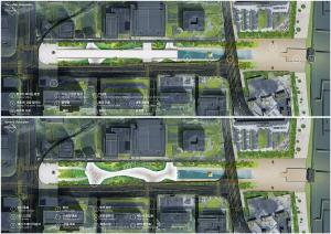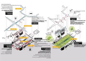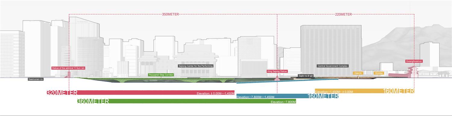 The underground space will be shaped as the opening space with maximum sense of participation, forming the double half-opened axis sequence to create different experience streamlines at two layers; in the Sejong Thousand-step Corridor at the upper layer where will access to the front area of the Gwanghwamun, historical style and features can be experienced; depending on the surrounding terrain, the passage covered with green plants at the lower layer well provide rich recreational functions and connect to the surrounding areas such as subway constructions.