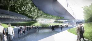 ▲通過水景及緩坡柔性過度,下穿前方市政道路,銜接北端歷史廣場。