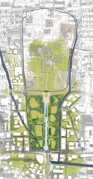 Within the scope of city design, construct the historical buildings with their original styles, restore the historical waters and release the walking space to implement function replacement; dismantle the current building after its age limit expiration and only reserve the landform of the building's platform-shaped foundation with greenbelt on it. Gradually transform the style and features of the site by implementing ring layers control to ensure the unification of the style and features at anywhere that can be seen in the site.