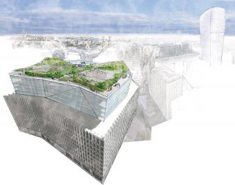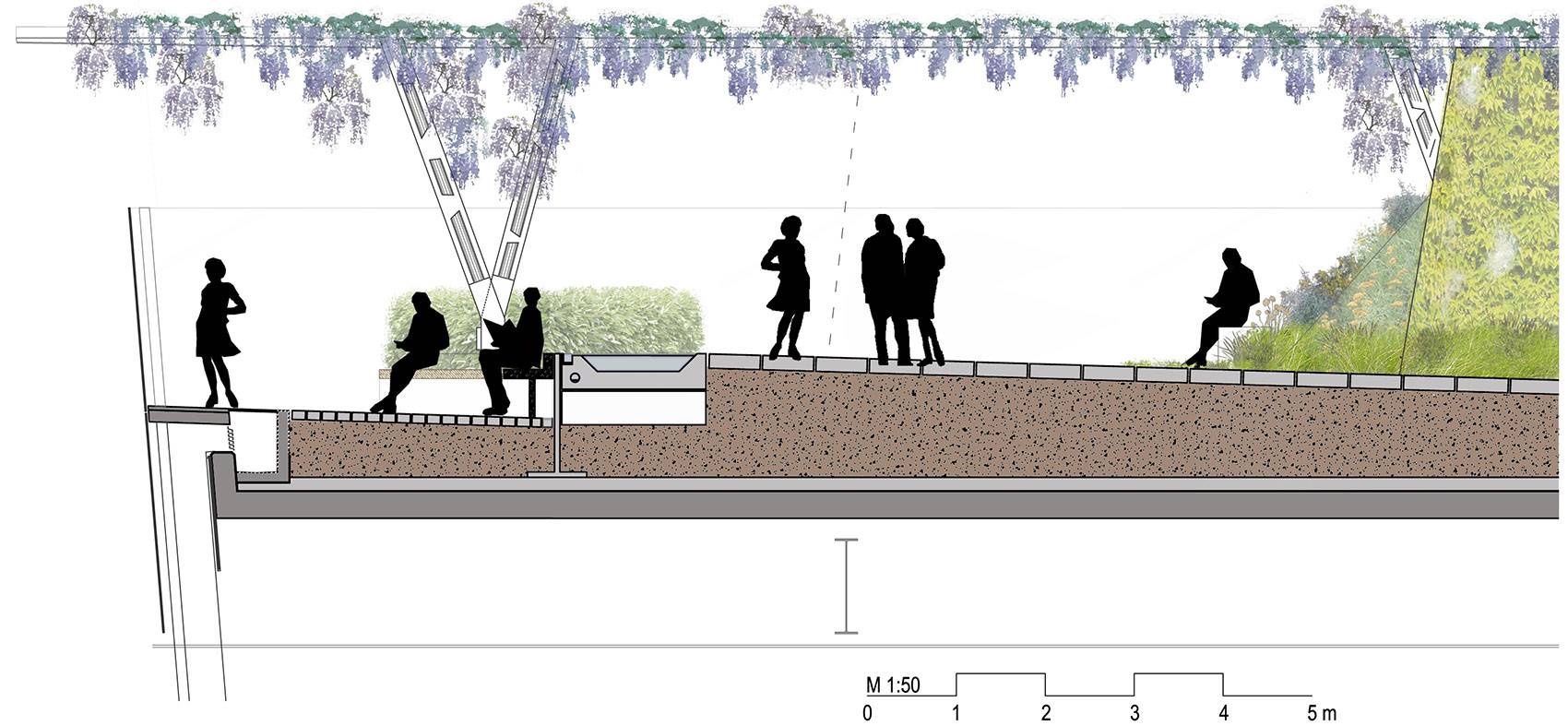 此外,這兩個涼亭的金屬結構還延伸到了辦公樓技術設備空間的上方,在毗鄰高層建筑的視覺方向上了隱藏了建筑的進風口。最終,原辦公樓的屋頂墻體結構不僅被很好地融合進了花園設計中,還配合著綠植創(chuàng)造出一系列受保護的休息空間。