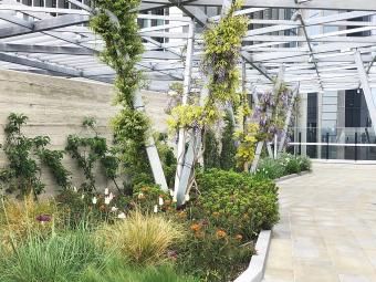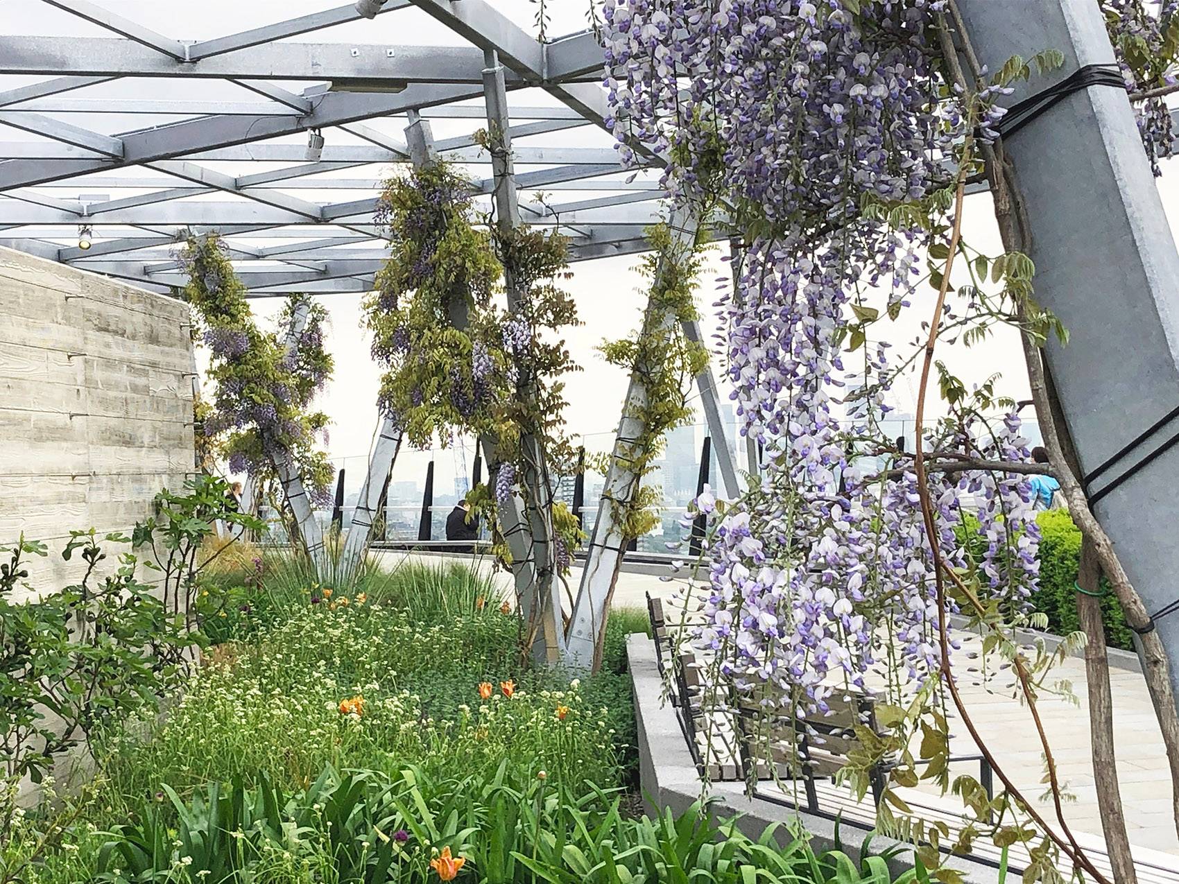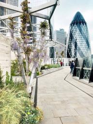 屋頂花園位于辦公樓的15層,其內的涼亭仿佛為整座建筑增加了一座小王冠,同時也充當著紫藤的支撐結構。該涼亭仿佛支柱,支撐著這個綠色的天篷。夏天時,郁郁蔥蔥的植被環(huán)繞著游客,不僅創(chuàng)造出必要的陰涼空間,更最大限度地豐富了倫敦的天際線。同時為了確保紫藤的健康生長,設計團隊還在部分地面鋪面的下方設置了一個特殊的基質層。