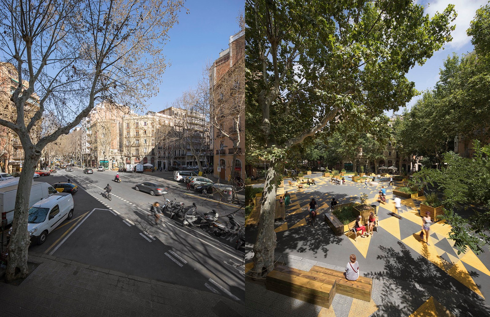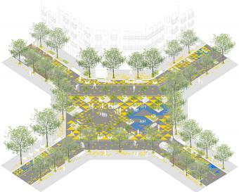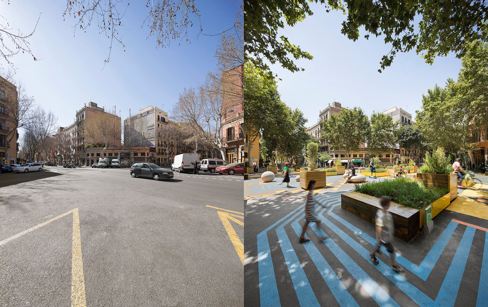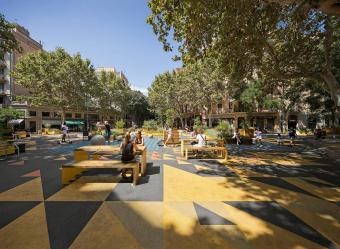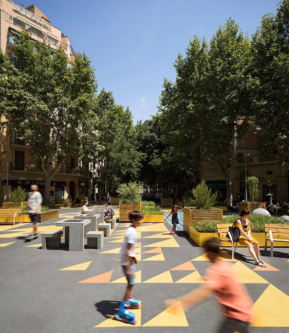 超級(jí)街區(qū)計(jì)劃目標(biāo)宏大,通過(guò)將街區(qū)合并為更大的城市單元來(lái)重新定義城市秩序。道路轉(zhuǎn)角處被開(kāi)發(fā)為廣場(chǎng),曾經(jīng)的車行道被重塑為綠色的健康街道,以人為本的改造計(jì)劃為城市贏來(lái)了新的公共空間。