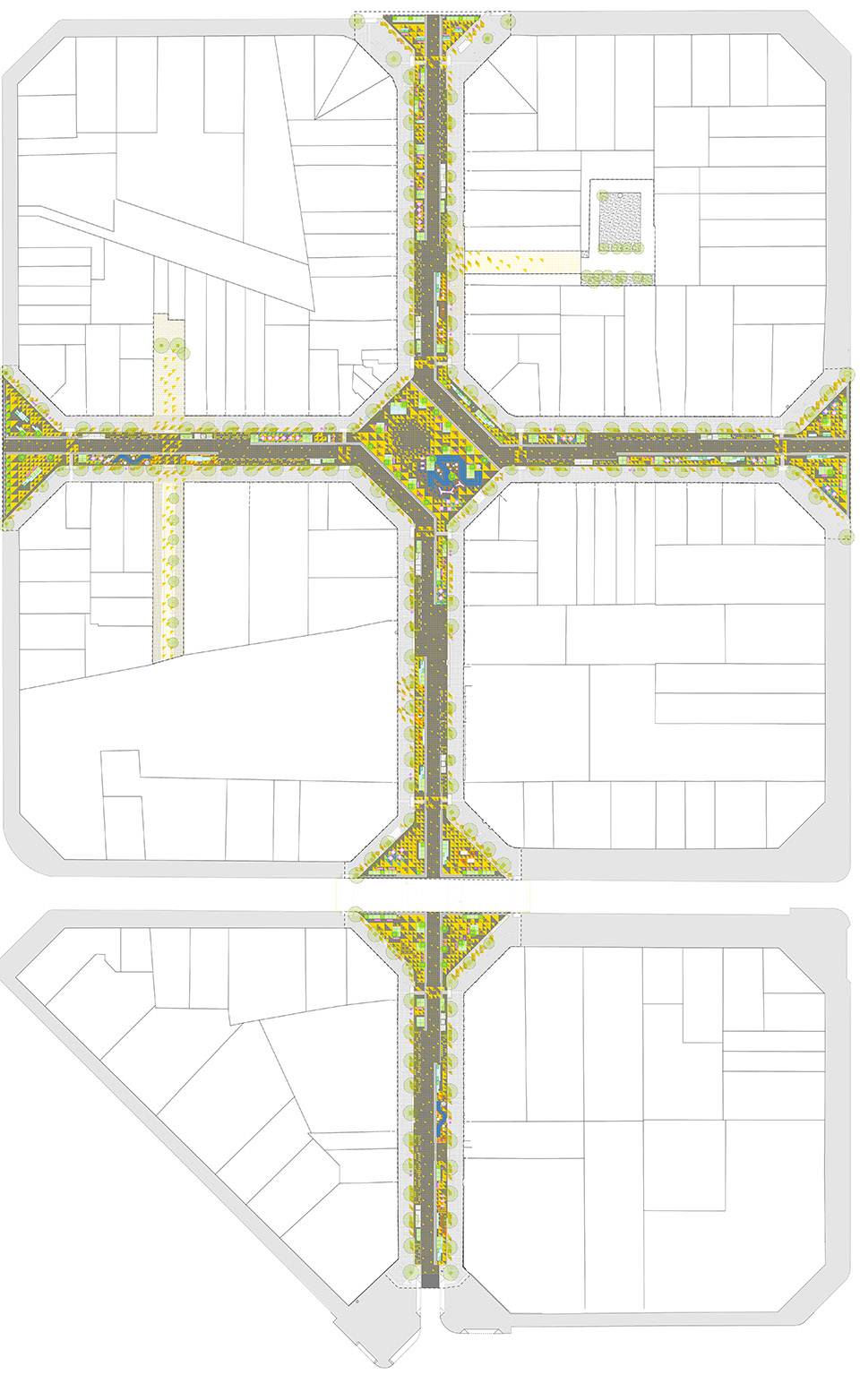 項(xiàng)目中的圖案,標(biāo)識(shí)及彩色鋪裝被設(shè)計(jì)成可拓展的網(wǎng)格,成為場(chǎng)地的基礎(chǔ)元素。網(wǎng)格同時(shí)也為項(xiàng)目中的圖形變化及城市家具元素的排布方式提供了參考依據(jù)。新的圖塊可沿著網(wǎng)格,為道路重新劃分空間。