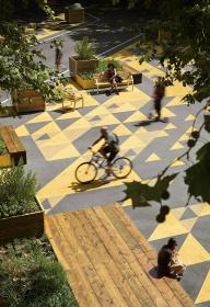▲道路轉(zhuǎn)角處被開(kāi)發(fā)為廣場(chǎng),曾經(jīng)的車行道被重塑為綠色的健康街道