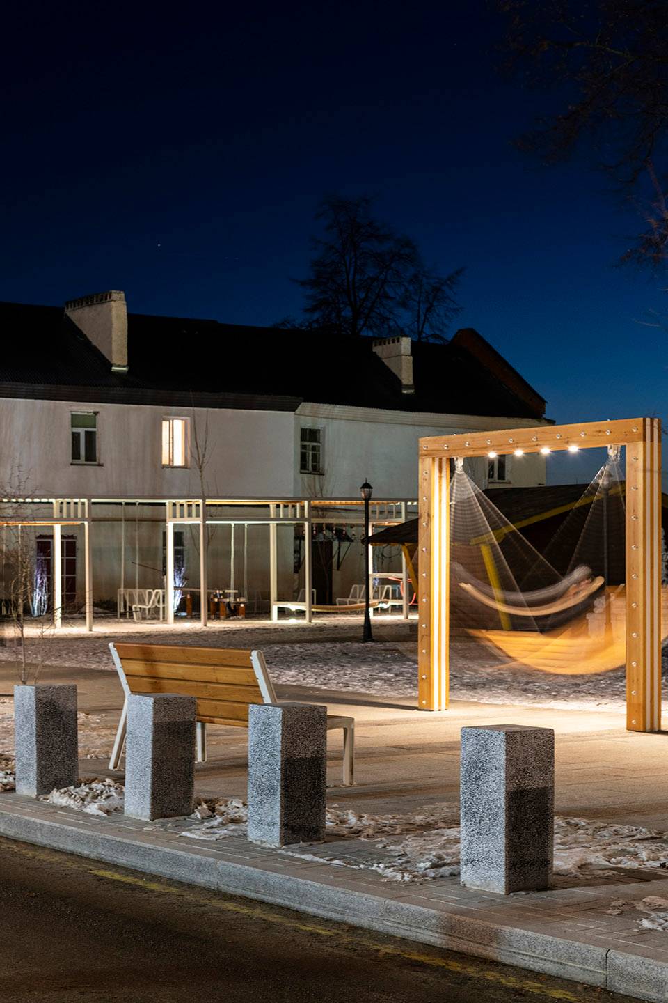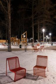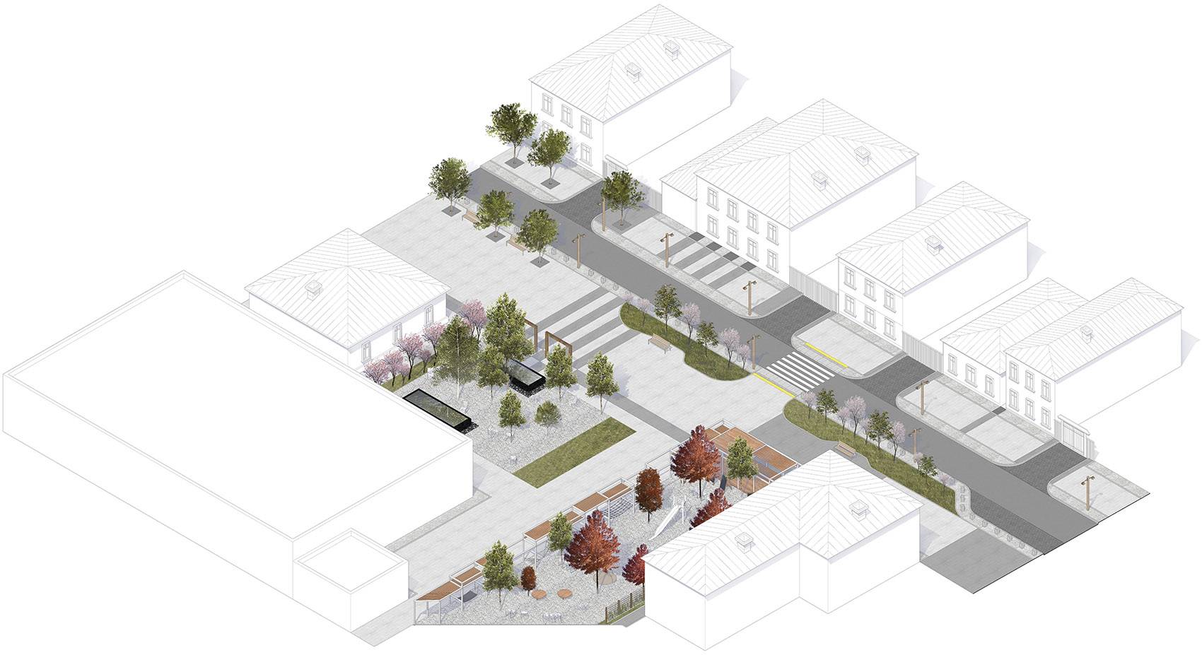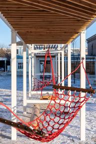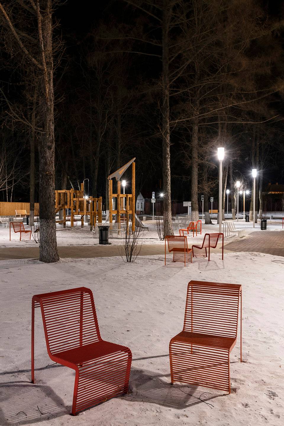 木制的燈具和隨性布置的橙色和紅色座椅為廣場帶來溫馨而寧靜的氛圍。游樂場上的木制元素與白色的大理石碎沙相互呼應。在春天,廣場上將開滿白色的唐棣,從而將廣場內部與馬路相隔開。