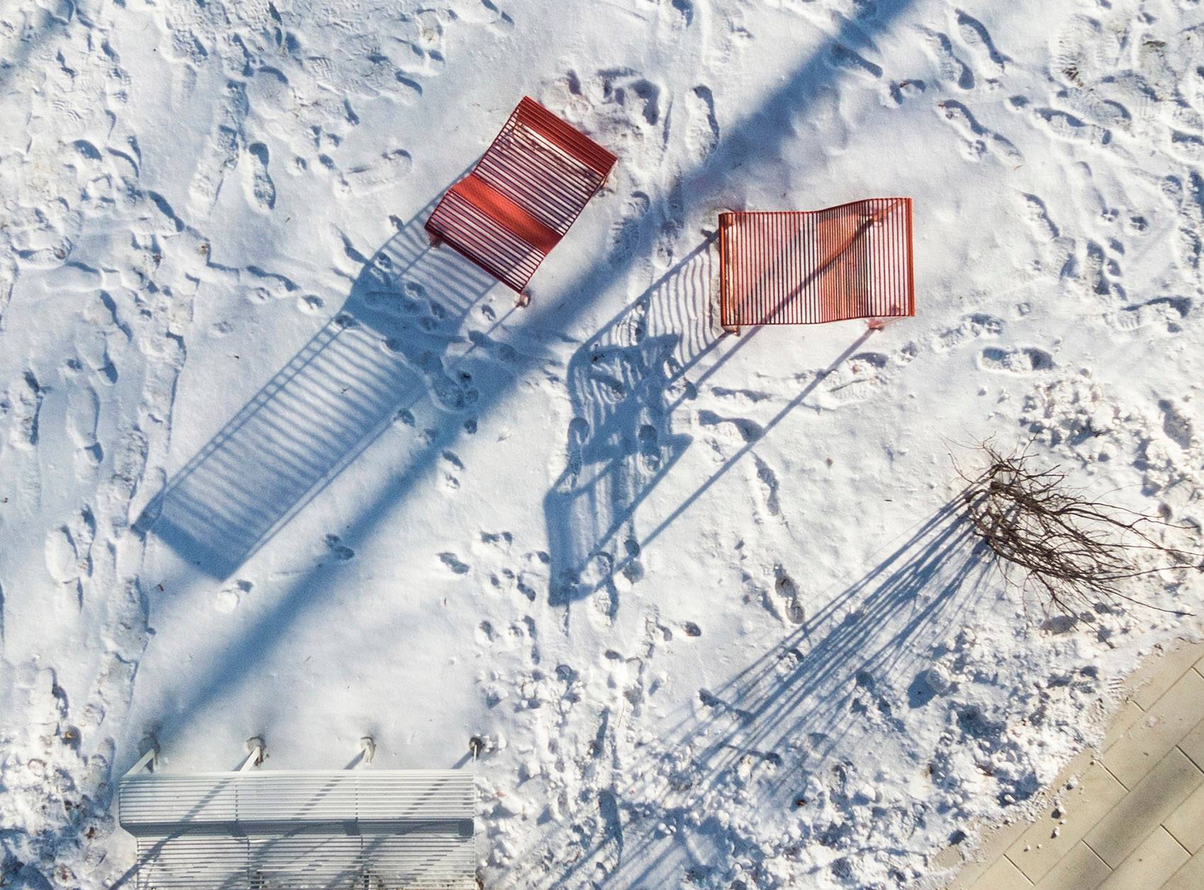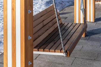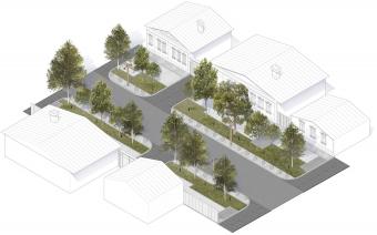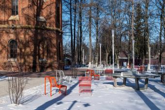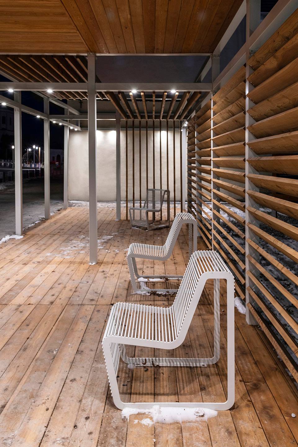 木制的燈具和隨性布置的橙色和紅色座椅為廣場帶來溫馨而寧靜的氛圍。游樂場上的木制元素與白色的大理石碎沙相互呼應。在春天,廣場上將開滿白色的唐棣,從而將廣場內部與馬路相隔開。