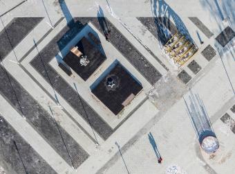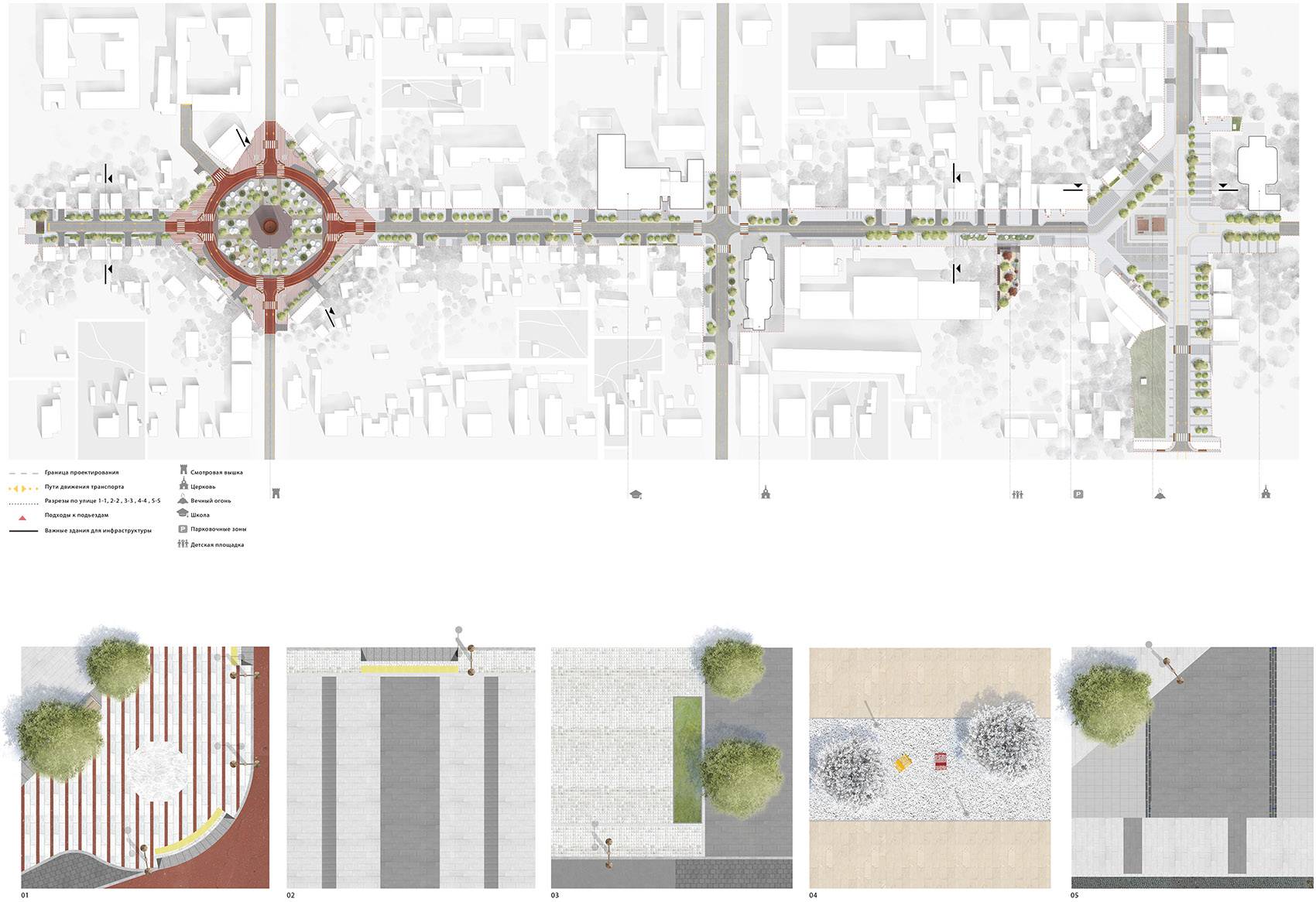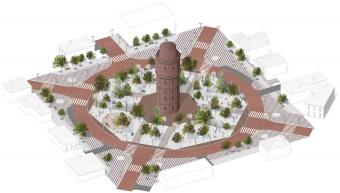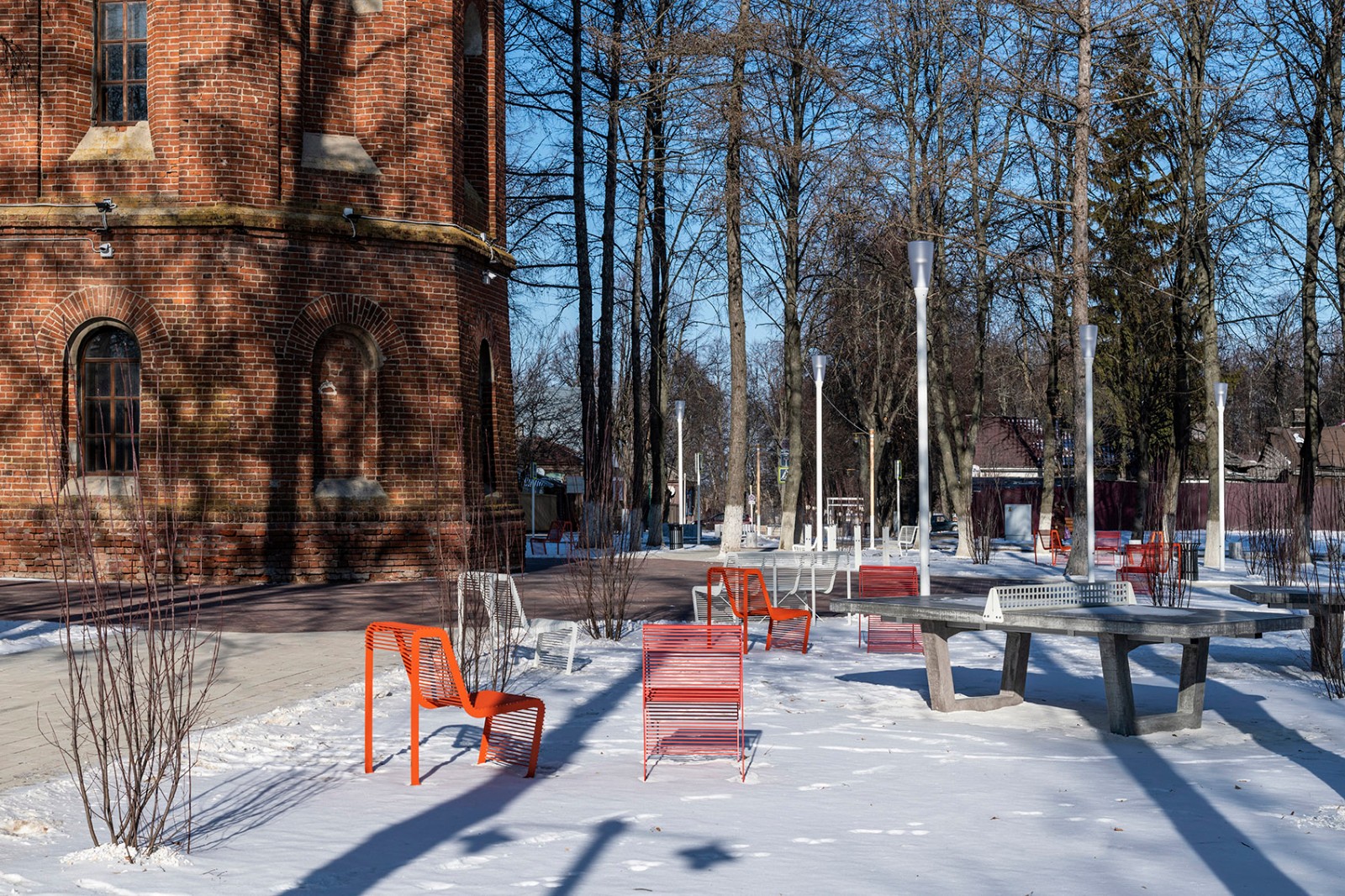 Zaraysk是莫斯科附近的一座歷史悠久的小城,至今仍然保持著舊時的舒適和溫馨感覺。磚砌的水塔是城市中最具吸引力的地標,讓人聯想到中世紀堡壘中的防御塔。為了強調水塔的地位,景觀團隊將其周圍的地面鋪設以白色大理石和磚紋混凝土板條,與塔身形成顯著的對比。同時,紅白相間的人行路面在車道與水塔間建立了連接。
