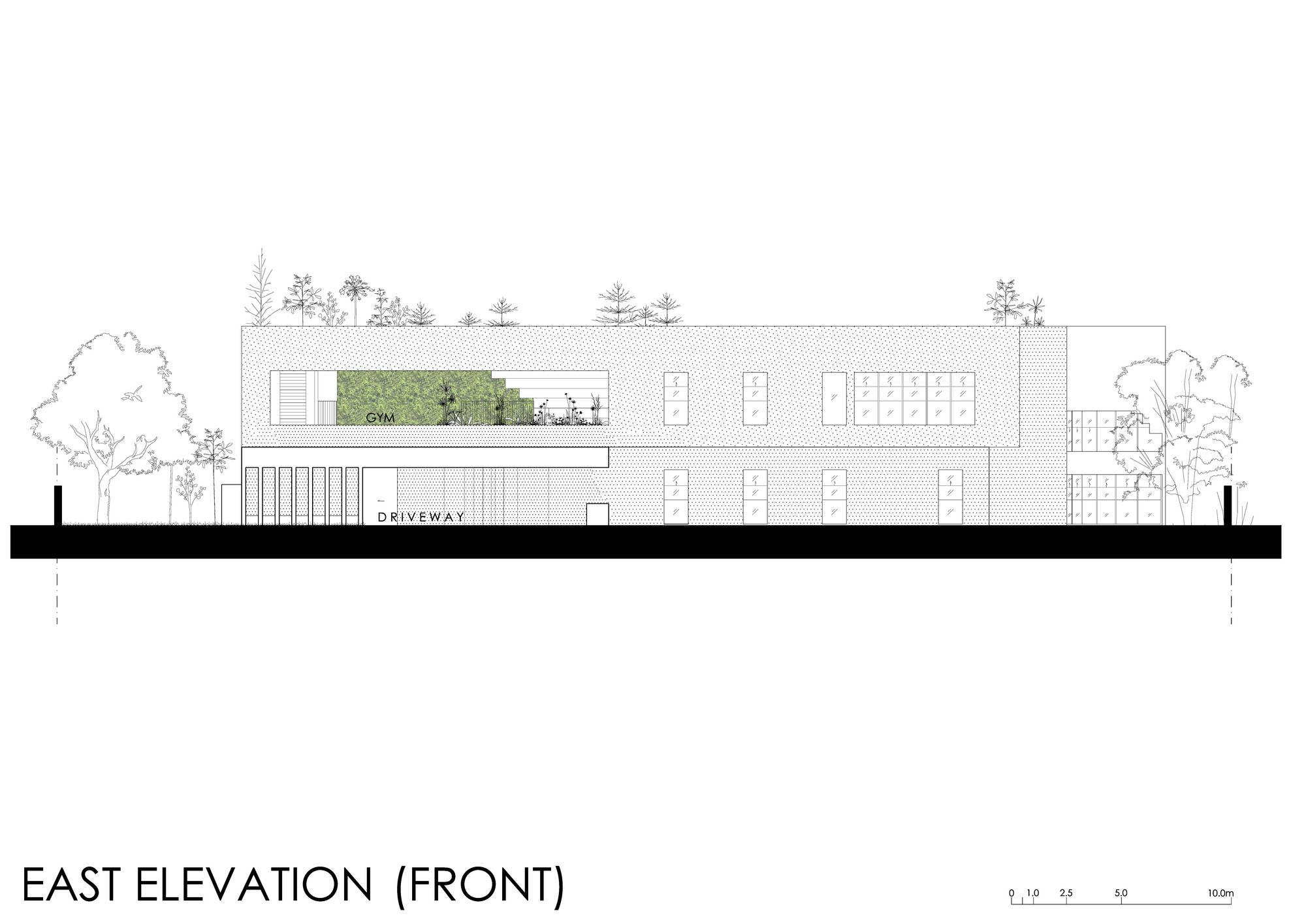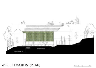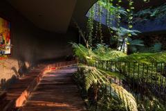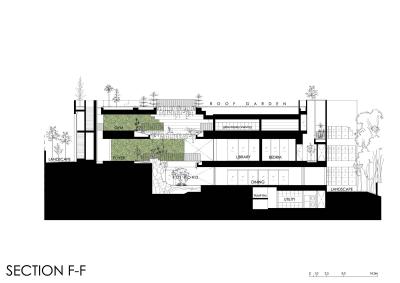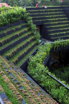 在入口門廳處,一面有滲漏歷史的舊擋土墻被改造成一個(gè)有瀑布的綠色庭院。拜訪者現(xiàn)在被熱帶雨林植物和瀑布的聲音問候著,我們可以從各個(gè)樓層欣賞這些景觀。利用現(xiàn)有地形,覆蓋場地的建筑物的組合被用作種植熱帶果樹的花圃,以降低周邊溫度和為室內(nèi)隔熱。