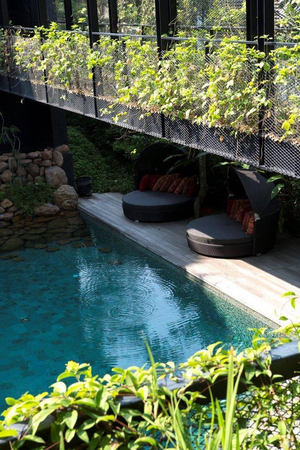 △ 所有的臥室都環(huán)繞著邊緣鋪著天然巖石的生物池
