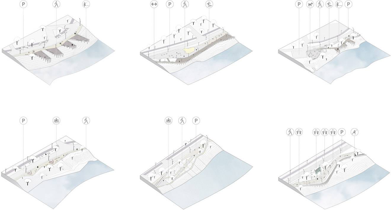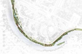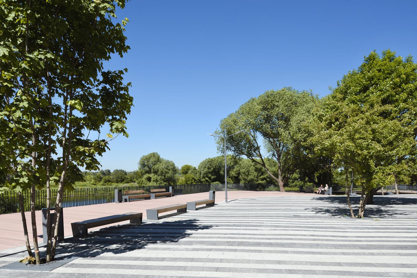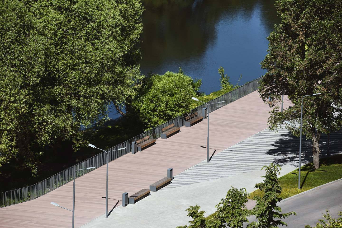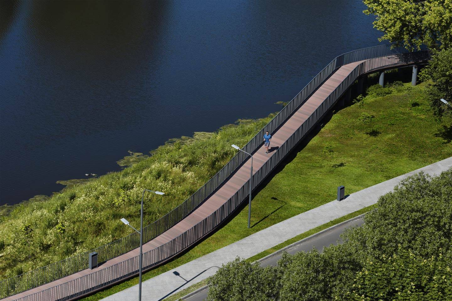 該項目的目標(biāo)是在松軟的河岸上創(chuàng)造出適合各個年齡段居民的公共空間。因而其總規(guī)劃策略是將Bykovka河岸陡坡上的狹長小路,改造成含有架空露臺的多功能濱水長廊。