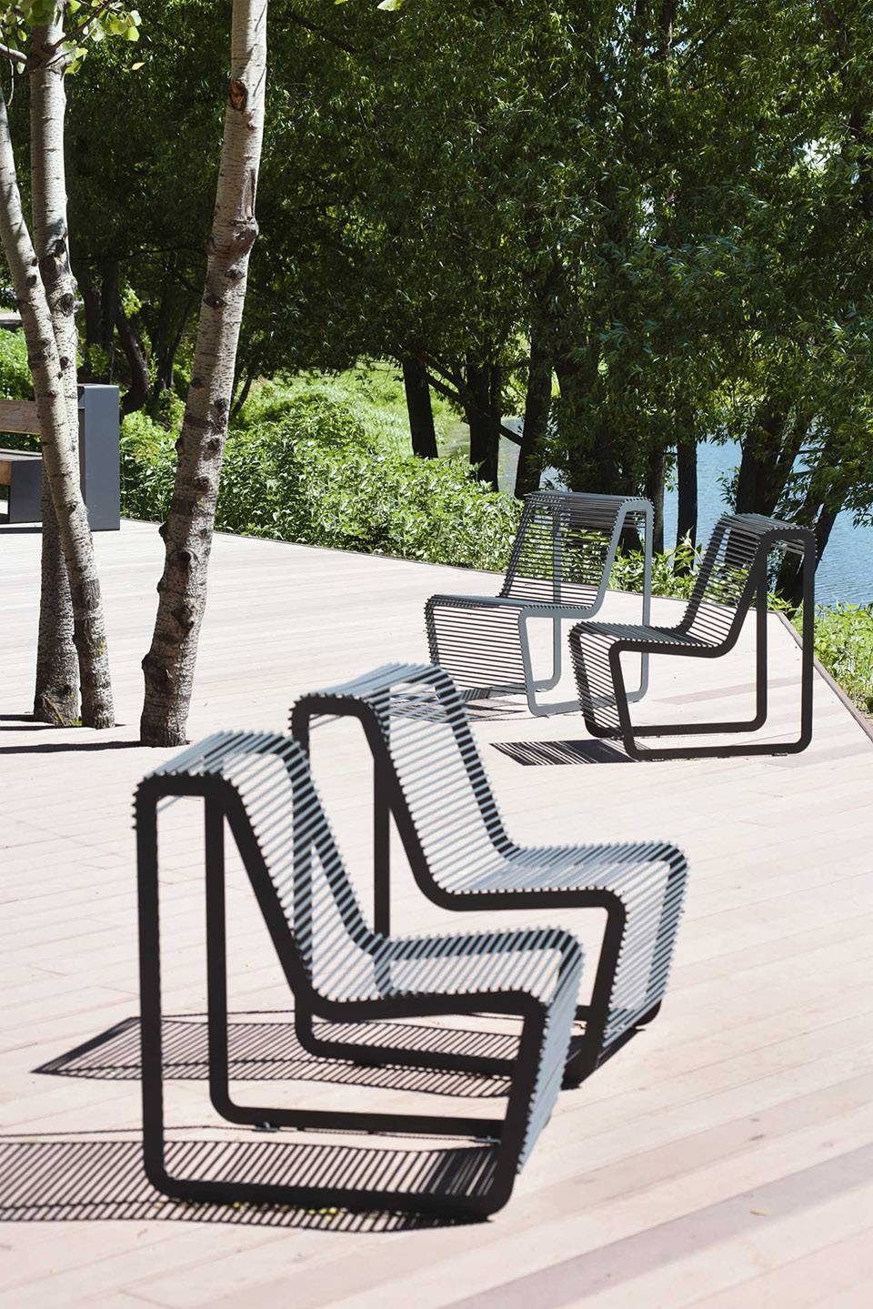 項目中采用了極簡現(xiàn)代風(fēng)的城市家具,由鋼條和松木制成,突出了木材原生態(tài)的自然色。家具樸素的配色和純粹的造型使其能 與自然環(huán)境巧妙的融合。平臺的圍欄被設(shè)計成“不規(guī)則”的形制,長短不一,更好地突出了自然感氛圍。