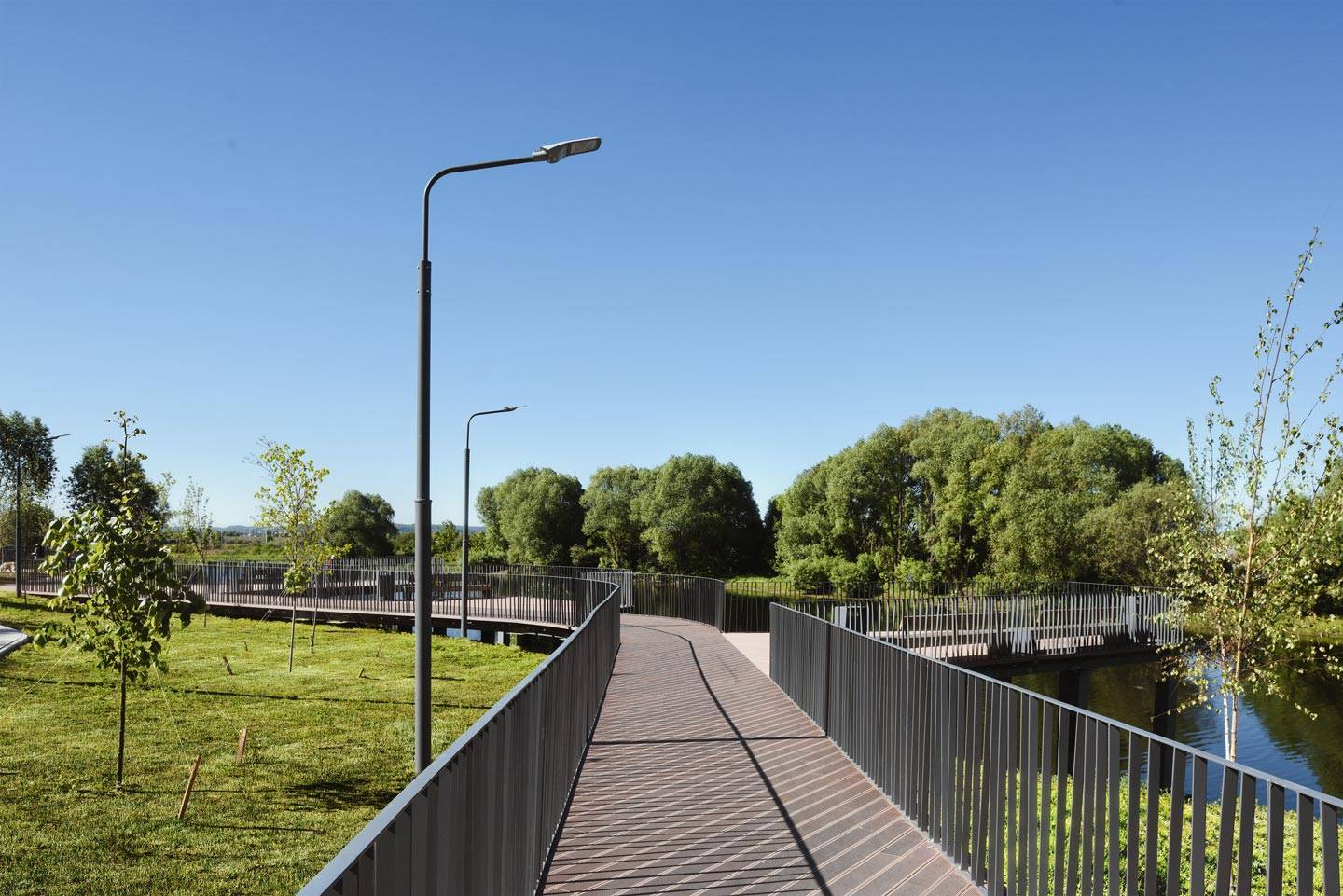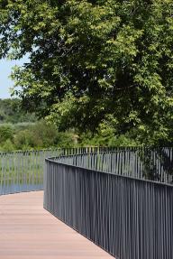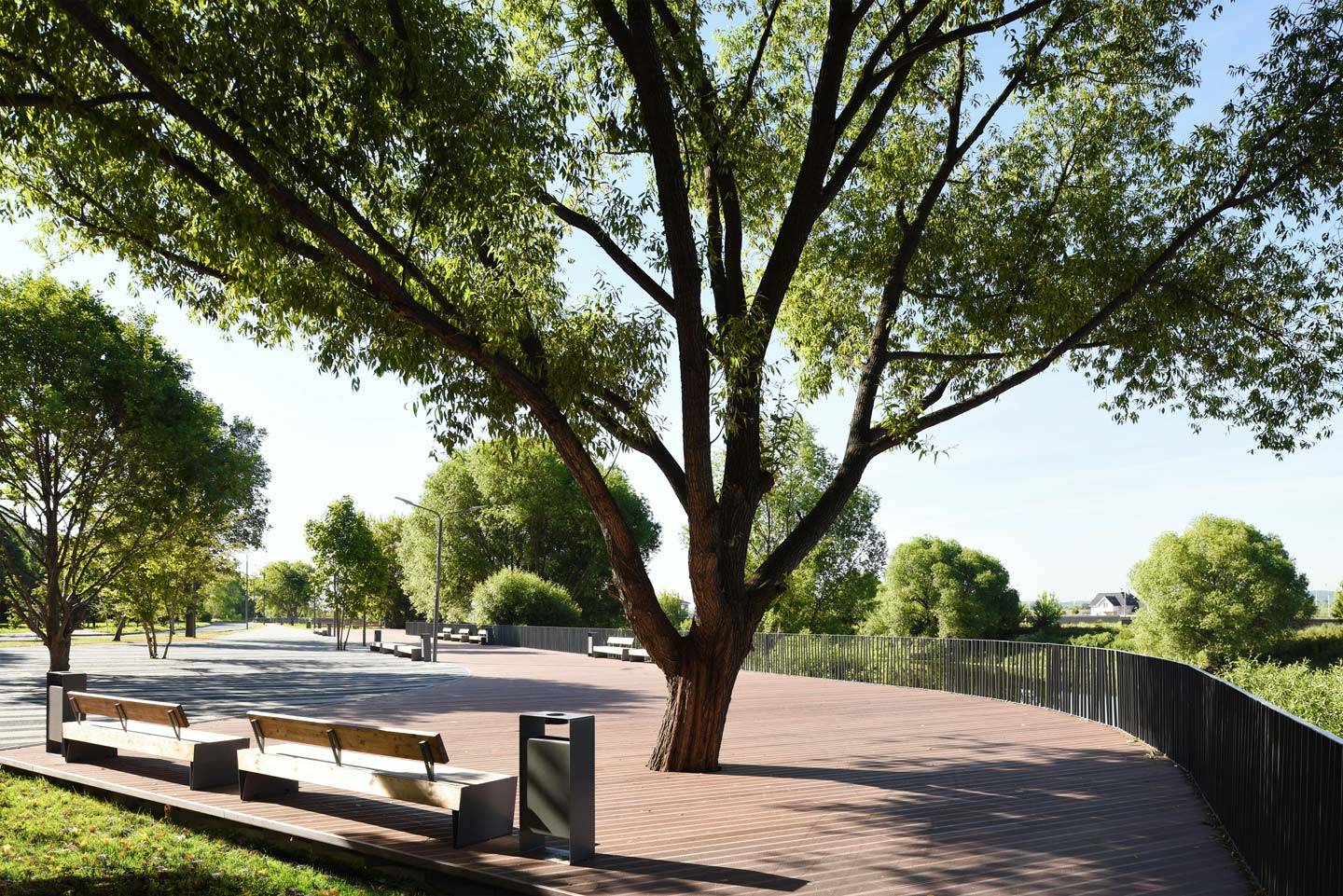 該項目的一個精彩之處在于復(fù)雜地形處架起的棧道及露臺。棧道的設(shè)置幫助設(shè)計團(tuán)隊拓寬了點(diǎn)的可用面積,并更好地規(guī)劃出河景的最佳觀賞區(qū)。蜿蜒的木質(zhì)小路延長了步行路線的長度,同時為自行車騎行及嬰兒車的使用提供了便利條件。主漫步線路起始于視野絕佳的觀景臺,讓游客可以零距離擁抱自然隱秘的美。