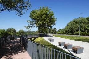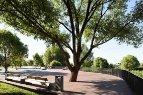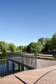 新河岸被分為兩個主要區(qū)域:安靜休閑區(qū)及活動區(qū)。活動區(qū)內(nèi)包括遛狗區(qū),適合釣魚的突出平臺,適合不同年齡游玩的游樂場及可以舉辦活動的中心區(qū)。安靜休閑區(qū)則是一條蜿蜒的棧橋,掩映在蔥榮的樹叢中,既有風(fēng)景優(yōu)美的觀景點(diǎn),又有隱蔽的休憩空間。