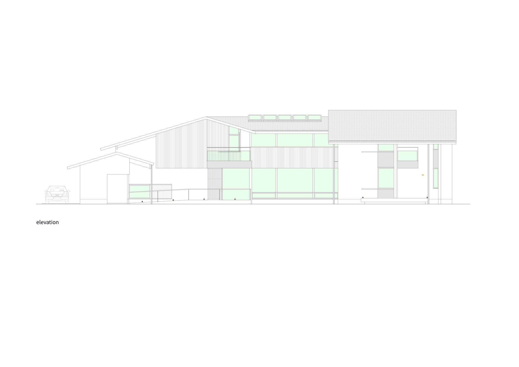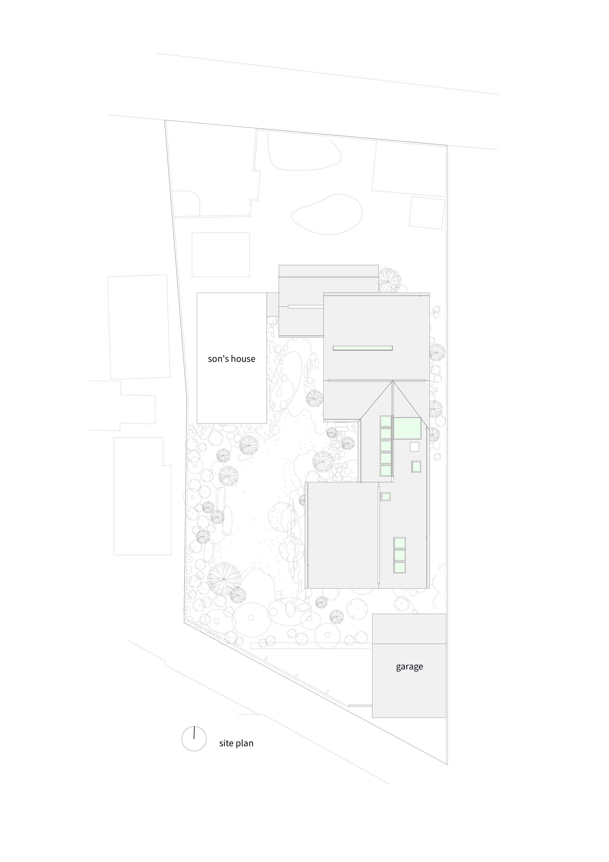業(yè)主也喜愛他的老房子,他們有一個請求,即盡可能多地保留花園中的樹木。盡管老房子會被拆除,但是花園里的樹木可以更貼近他們的生活,留下昔日建筑外觀的記憶。在原有老房子的入口處,我們設(shè)計了一個室外大廳,在半戶外環(huán)境中連接新建的房屋和原有的三層建筑。它是一個輕輕連接兩個住戶的公共入口。三層的房子進(jìn)行了更新,這對夫婦的兒子一家住在那里。