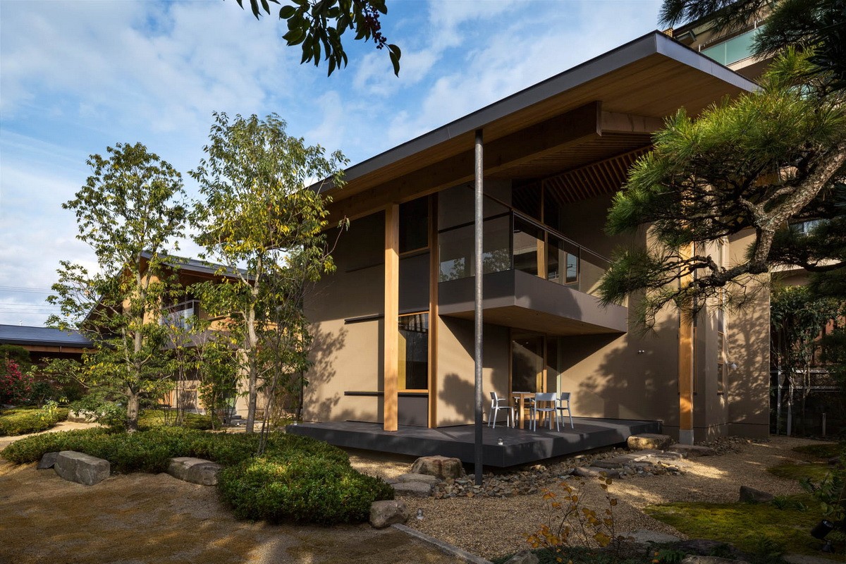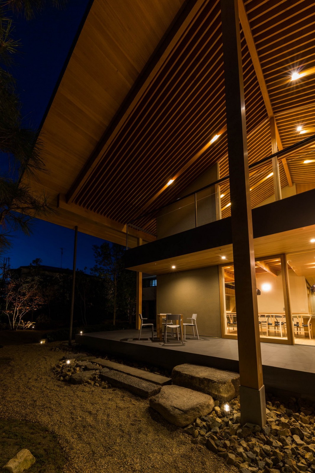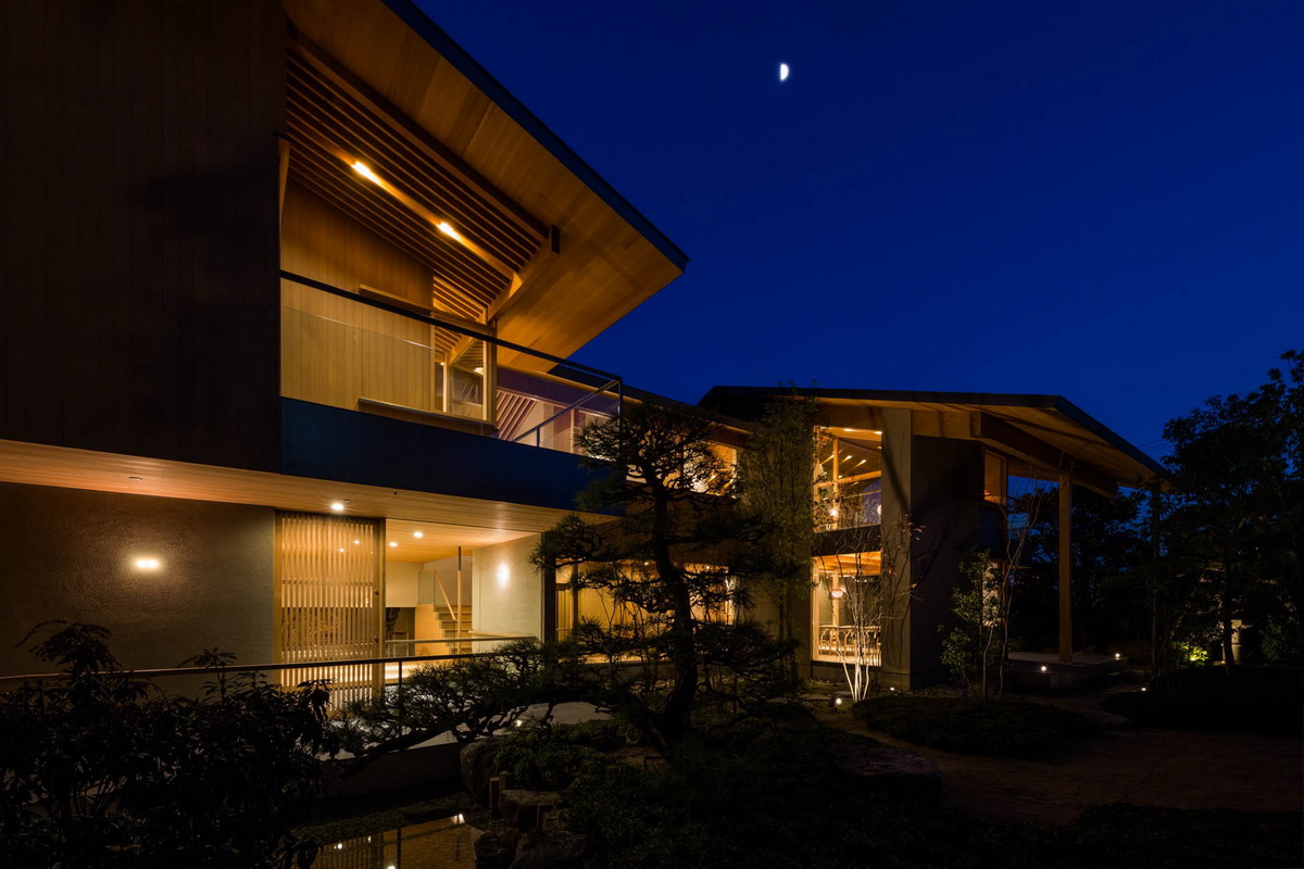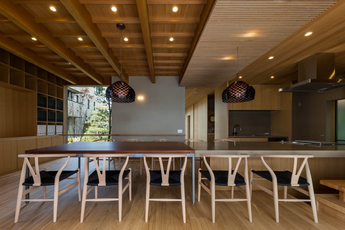 這是一對夫婦的住宅。場地位于大阪市郊。原有場地上有一座房齡達(dá)70年的老房子,但是本次業(yè)主要求我們拆除這座老房子,新建一座木結(jié)構(gòu)建筑。通常只有這對夫婦居住這棟房子,但也有很多機(jī)會與親友在此團(tuán)聚。無論是僅被該夫婦兩人居住,還是多人的團(tuán)聚,我們都是按照恰當(dāng)?shù)某叽绾凸才c私密空間的適度劃分來進(jìn)行設(shè)計。
