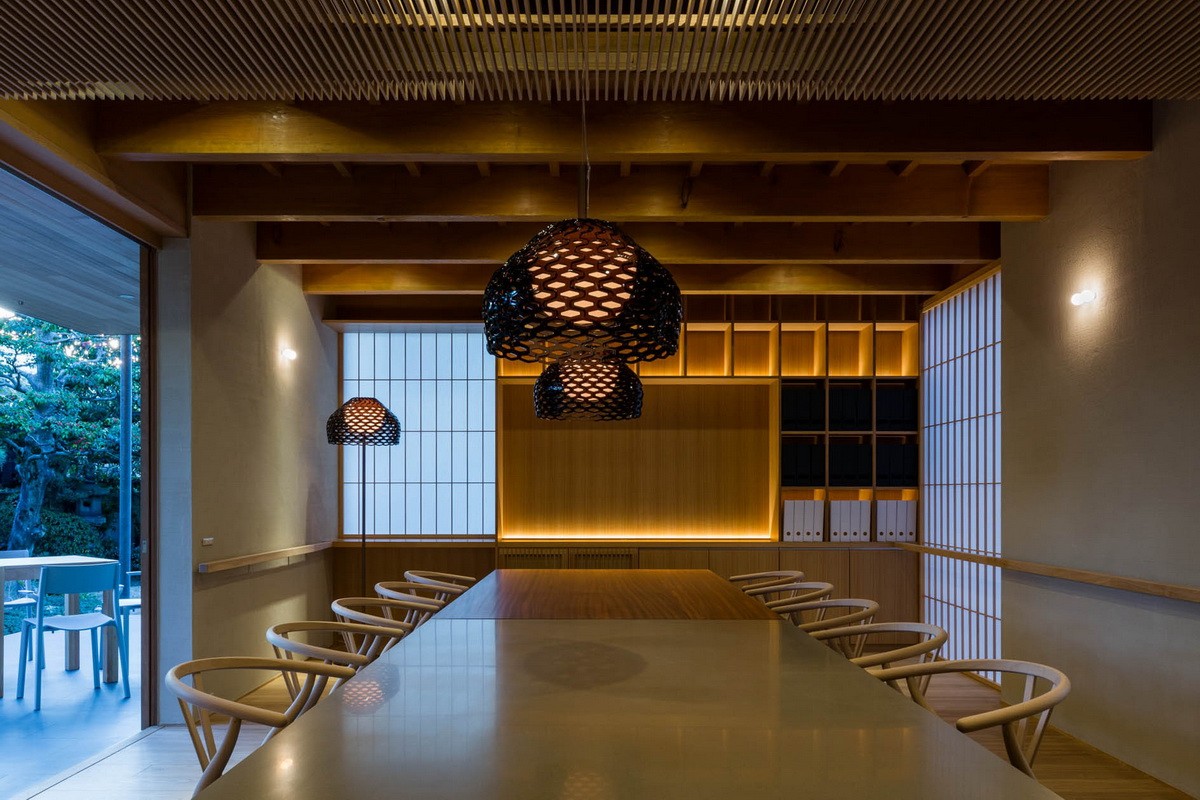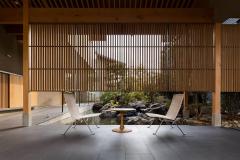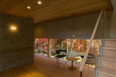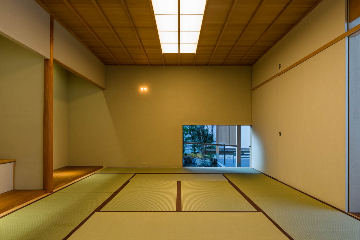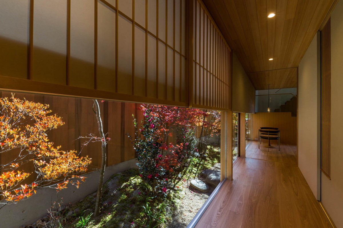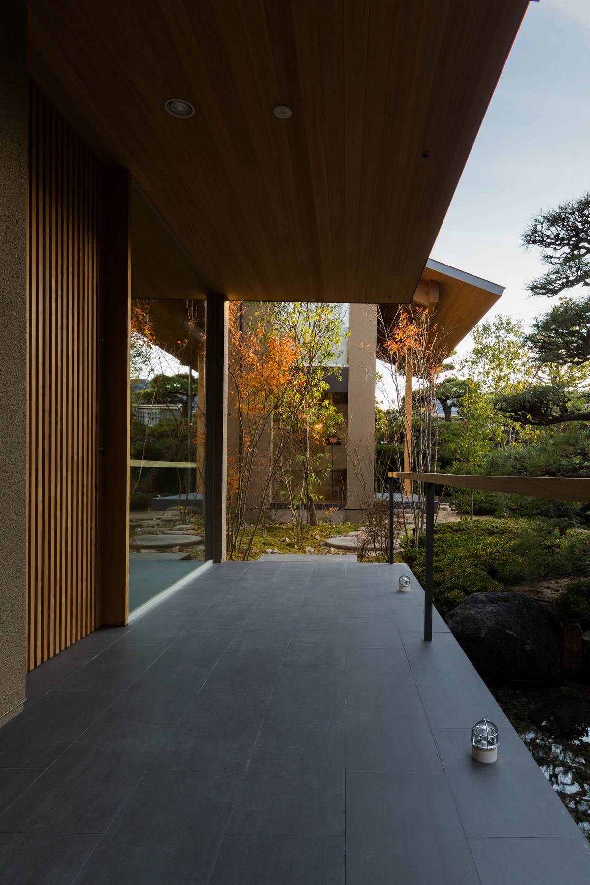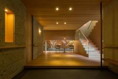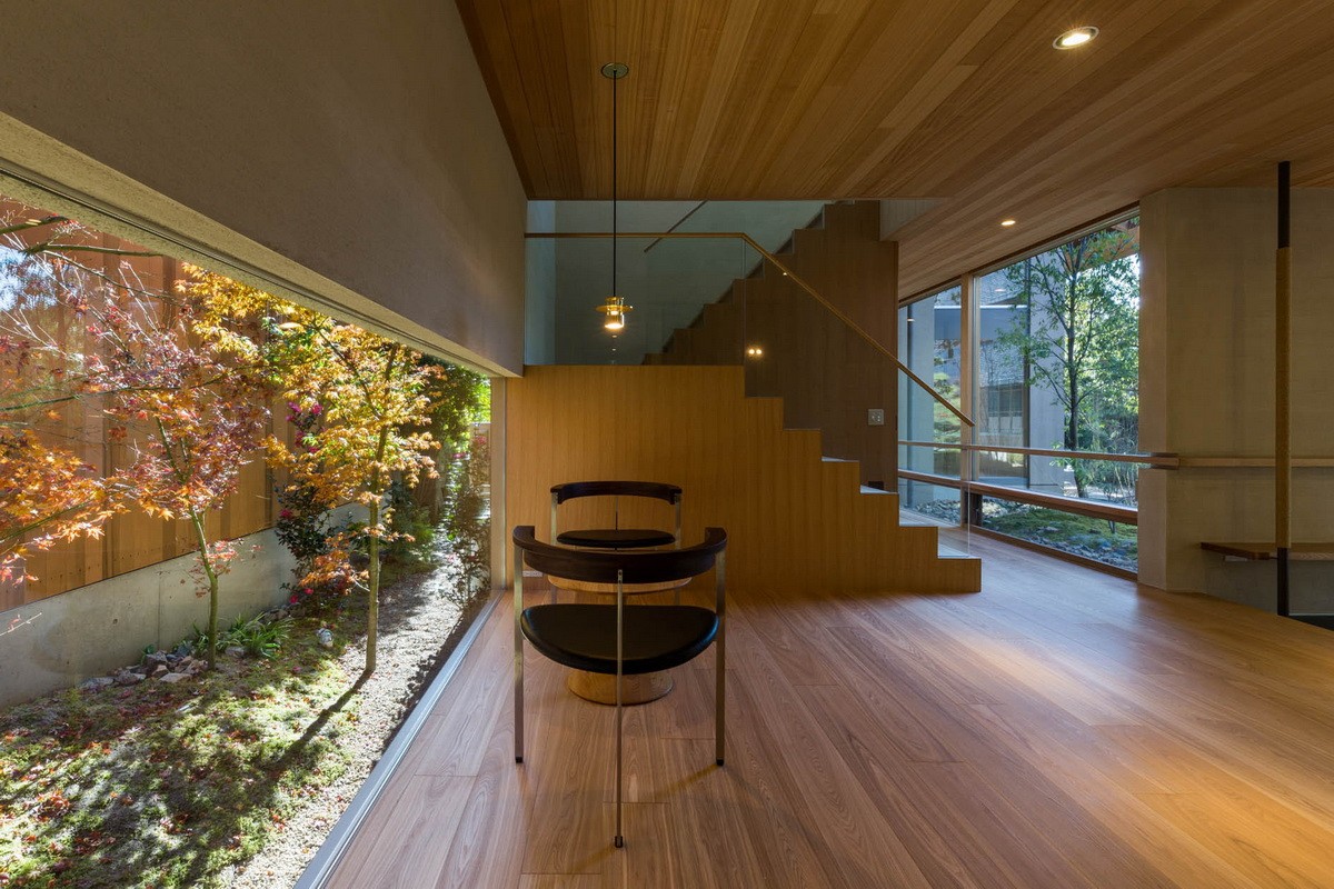 關(guān)于觀賞花園的視角,我們不是觀賞整個花園,而是設(shè)置了窗戶,這樣它就成為了不同自然景觀的切口。從室外大廳的前方,你可以看到腳邊倒映在水中的綠色,這樣你可以透過格子木架看到。而在入口大廳處,你可以看到從一樓窗戶邊水平延伸的綠色。業(yè)主希望這棟房子不引人注目,像花園里的風(fēng)景一樣舒適。我們與枯木景觀建筑工作室一起探索了花園與建筑之間的關(guān)系。