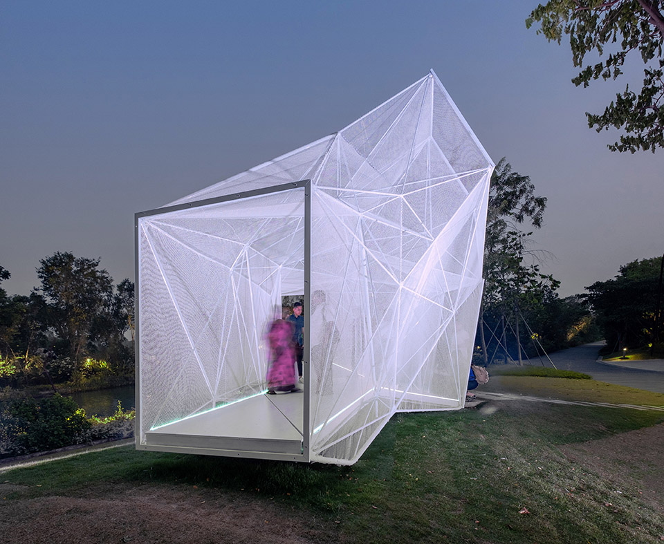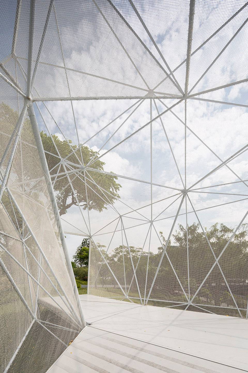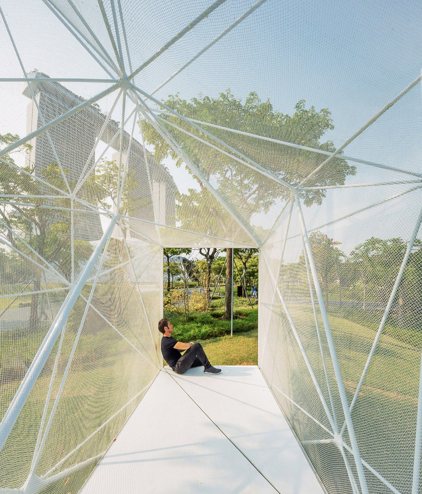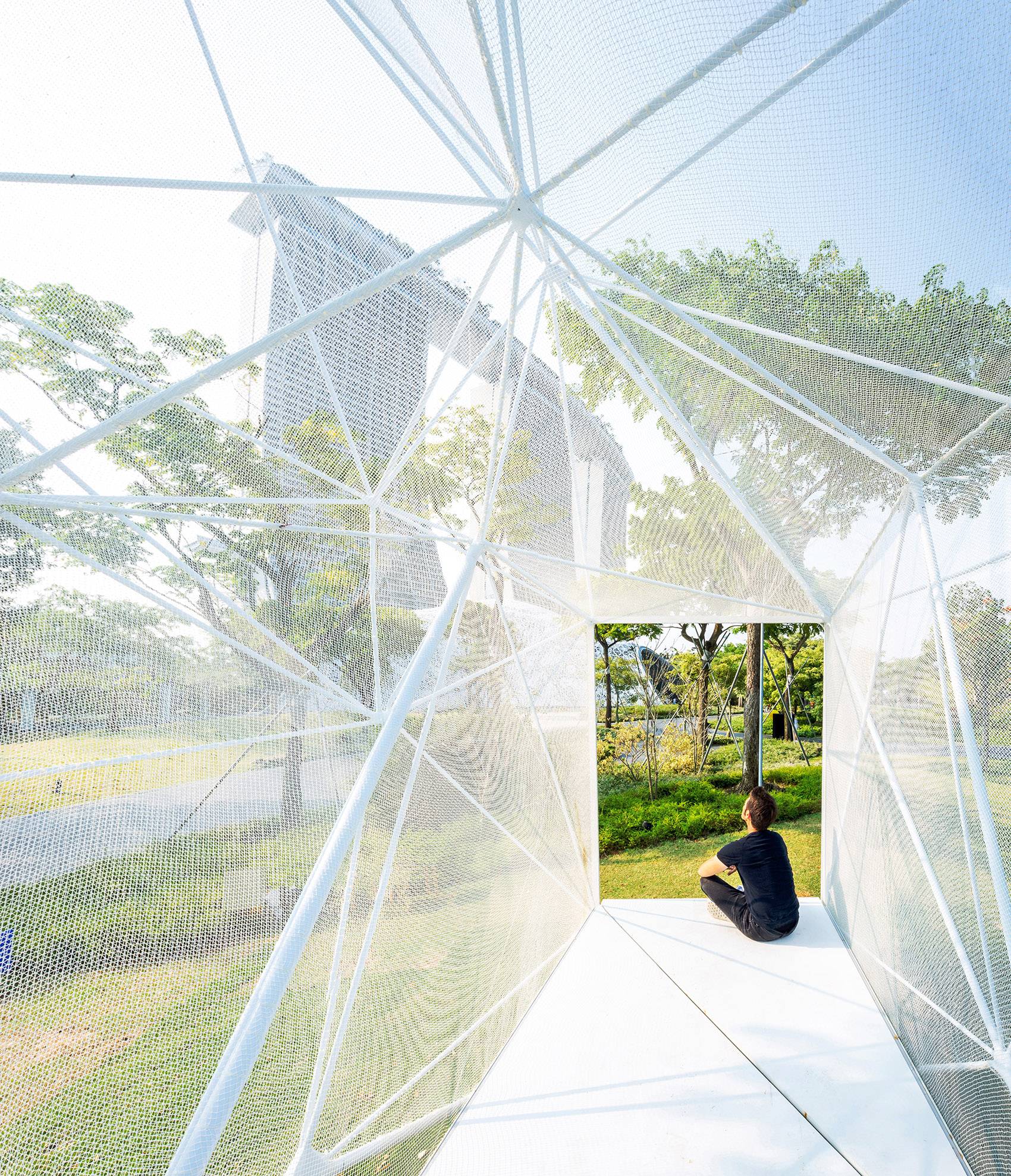AirMesh的實(shí)用主義形式主要取決于視野的方向。涼亭結(jié)構(gòu)由面向周圍景觀的四個(gè)矢量定義,分別是蜻蜓橋、銀色花園、濱海灣金沙酒店以及涼亭入口本身。四個(gè)矩形的視圖框架圍合出整體空間,并以多角多面的形式重新詮釋了傳統(tǒng)中式燈籠的形象,展示出微妙的光線和色彩變化。