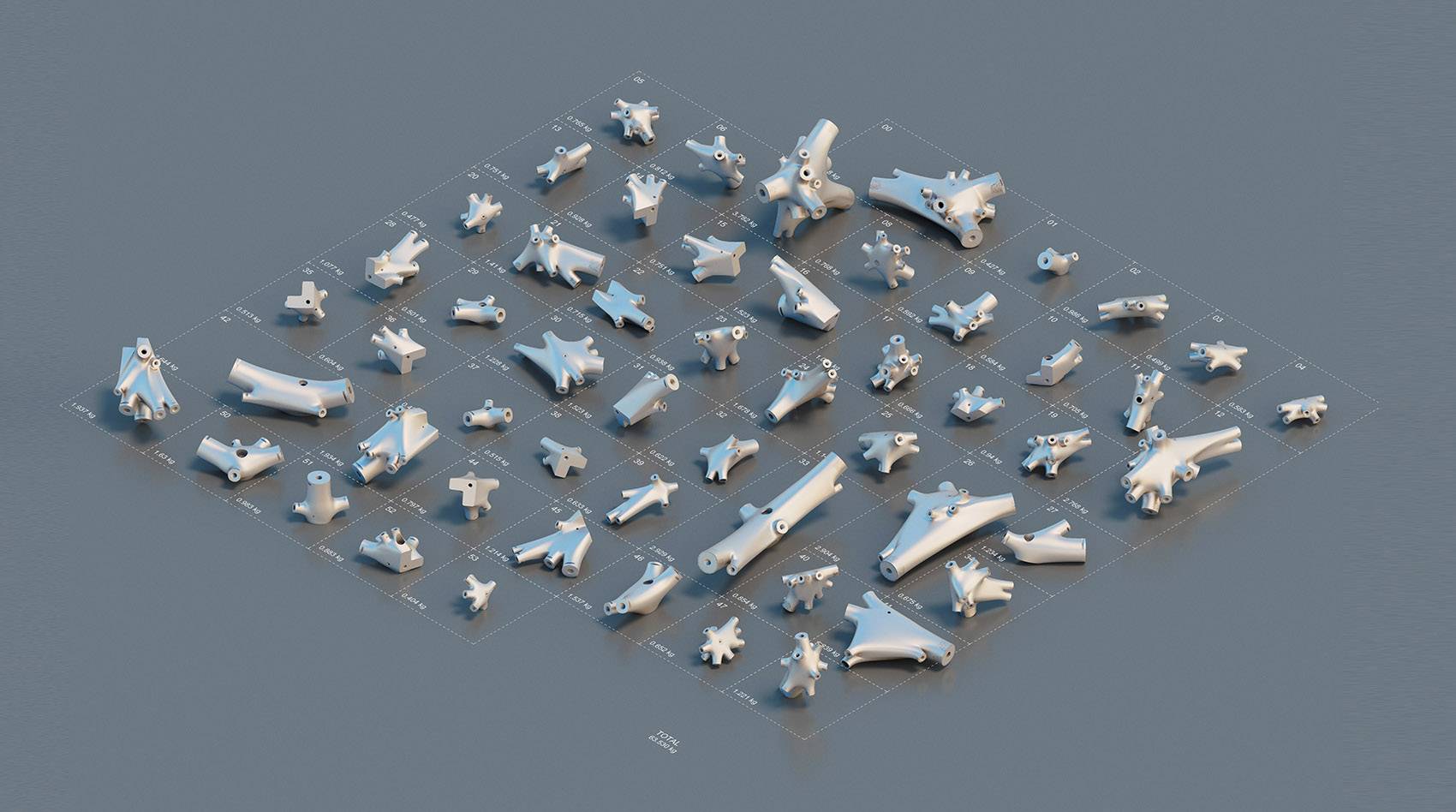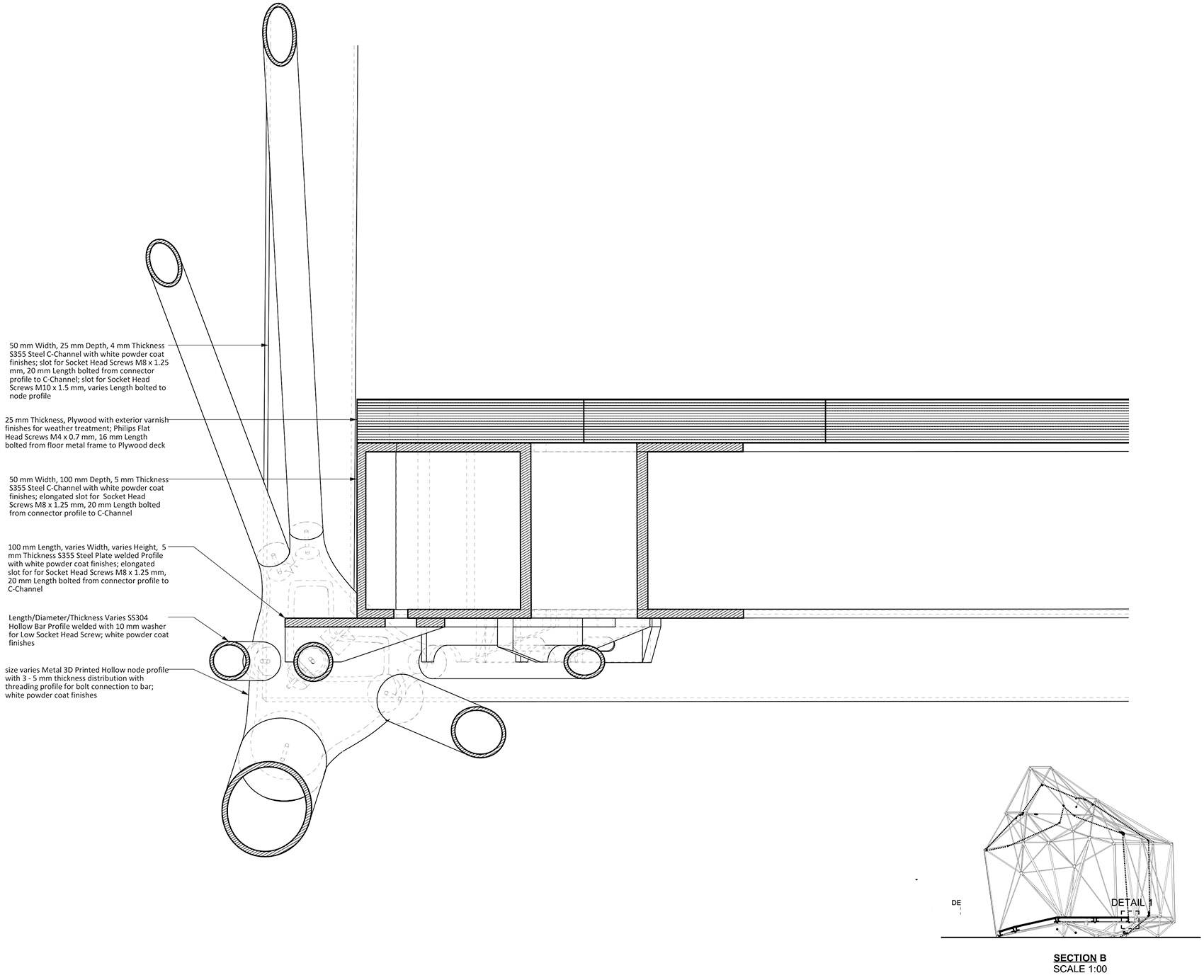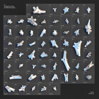 涼亭由216個(gè)擁有不同長度和截面的桿體支撐,并通過54個(gè)形狀各異的鋼銅合金打印連接件進(jìn)行固定。連接件方面的巨大技術(shù)創(chuàng)新使結(jié)構(gòu)的組裝工作僅需5位工人在2天內(nèi)即可以完成。節(jié)點(diǎn)內(nèi)部的螺紋也可借助3D打印實(shí)現(xiàn),從而與隱藏在桿體內(nèi)部的螺栓進(jìn)行組裝。整個(gè)涼亭的安裝只需要不同直徑的六角扳手即可完成。