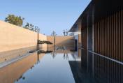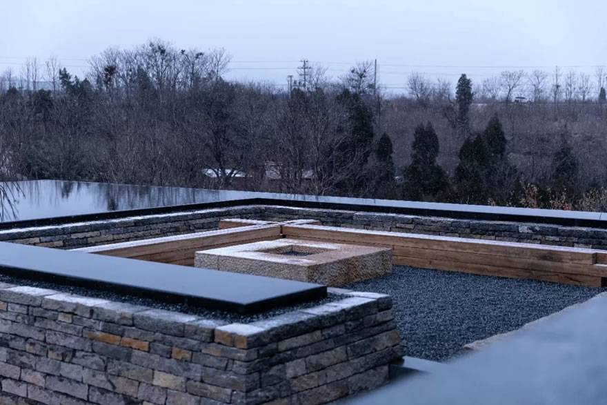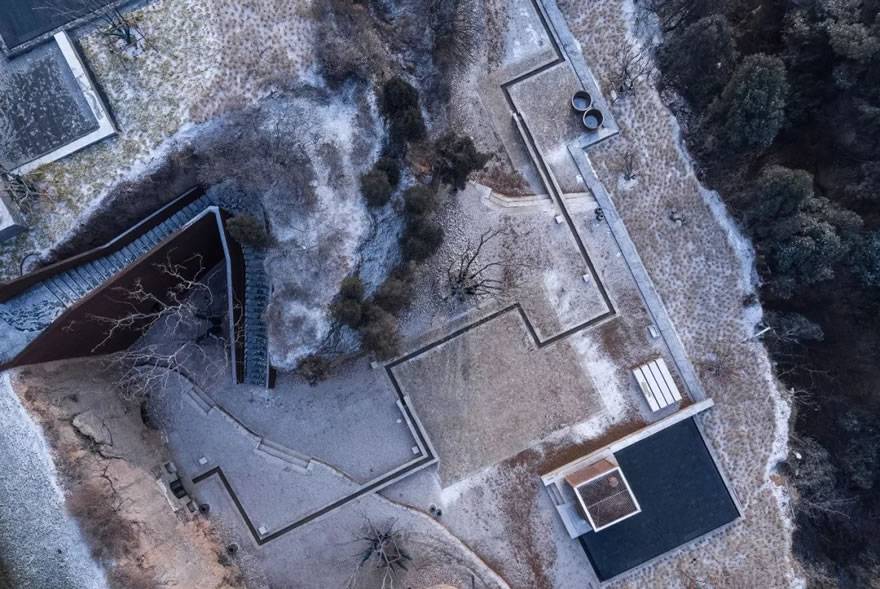 設(shè)計中最大限度的保留地形地貌,利用地塊本身的高差設(shè)計出符合場所氣質(zhì)的景觀氛圍。當(dāng)?shù)厥娘L(fēng)化面拼疊的景觀池;8米高差的山壁、裸露的黃土配以鋼板扶梯,空間感、質(zhì)感的強烈對比,直接了當(dāng),令人震撼。