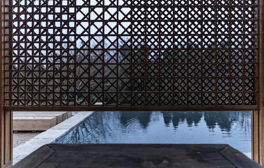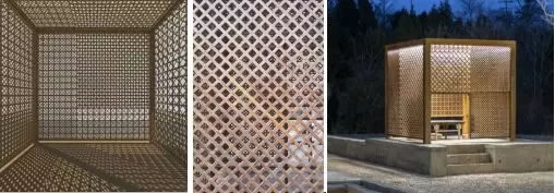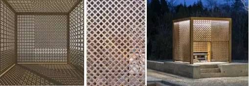 在茶亭外墻面的處理中,為了營造光影效果,利用雙層木格柵,處理亭子的墻面,四面墻四面不同的花紋,透出四種不同的光。從里往外看,或是夜幕降臨后茶亭里發(fā)出的光,又或是水隱映出茶亭的光影,顯得生動有趣。