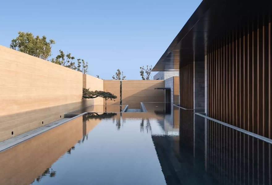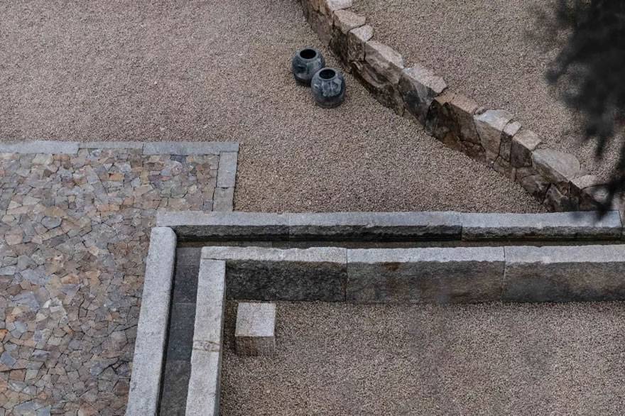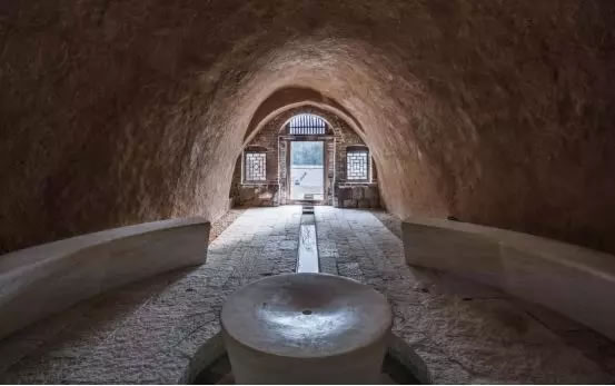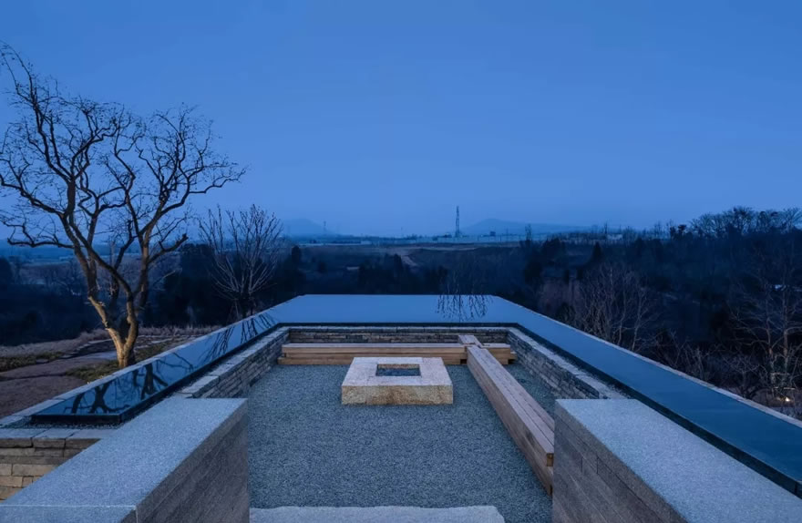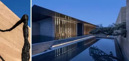 窯洞內(nèi)壁用輕設(shè)計的方式進(jìn)行飾面處理,保留了本身的質(zhì)感。地面上的石料運用傳統(tǒng)手鑿石進(jìn)行手工拼疊。窯洞內(nèi)部用整塊的米黃色洞石做座椅與噴泉,水緩慢的從窯洞的深處淌出來,流進(jìn)窯洞外的水渠里,貫穿屋外的整個場地。