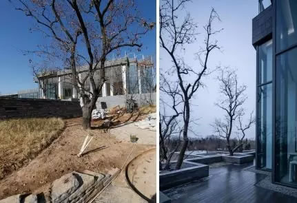 為保留柿子樹,前期設(shè)計及后期落地可謂煞費苦心。因設(shè)計需要,部分樹干會被埋在土里。后經(jīng)團(tuán)隊反復(fù)斟酌,最終為這四棵柿子樹修建了天井,讓它們?nèi)耘f安然的生活在這片土地上。