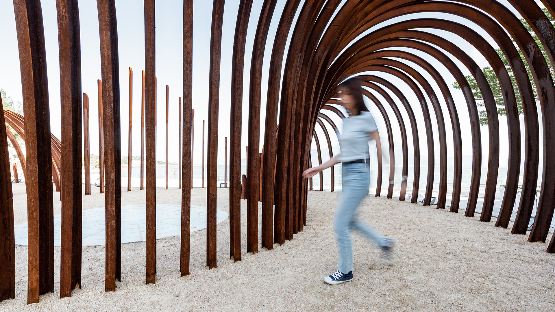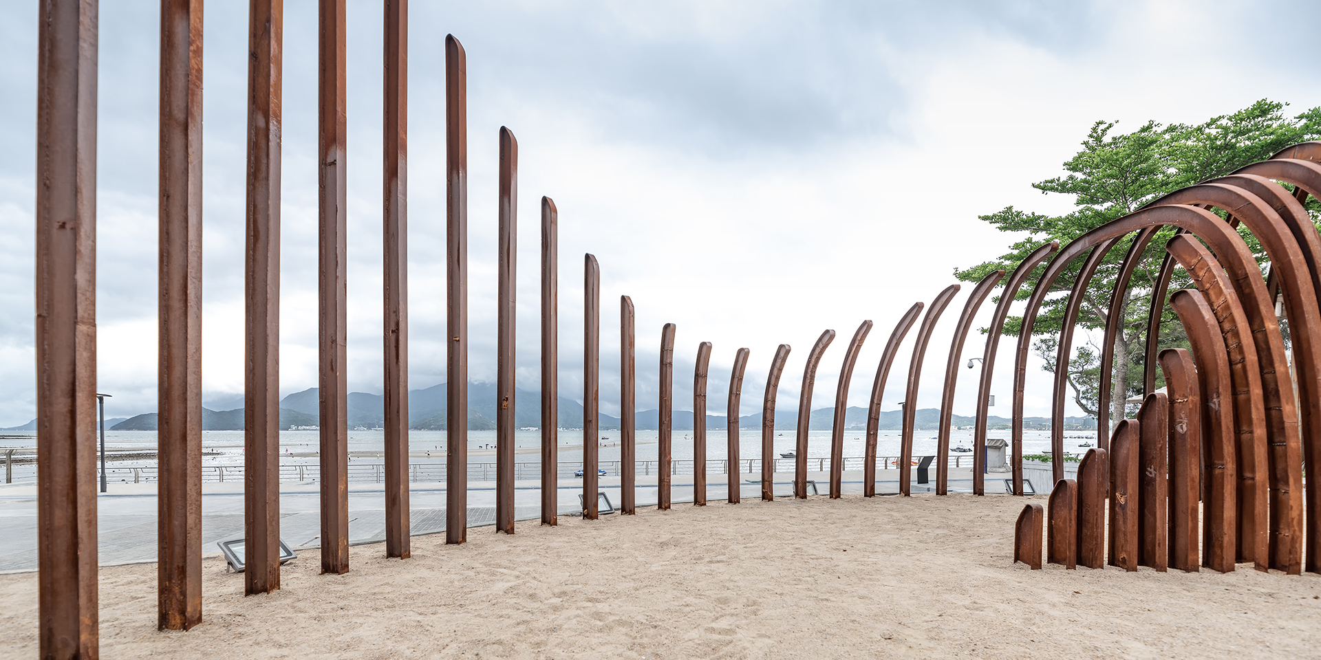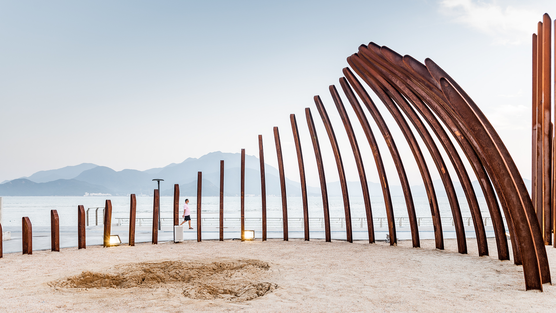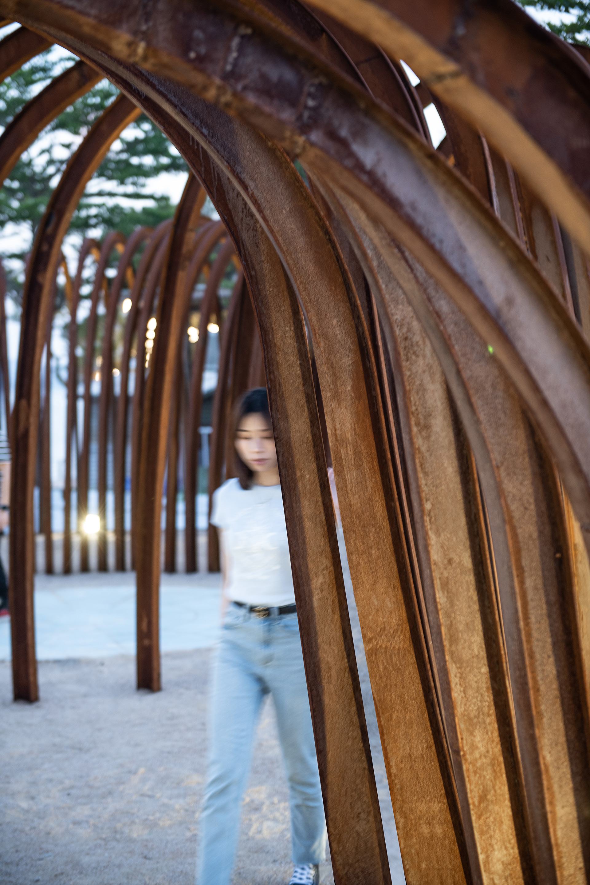 “海之韻”設(shè)計突顯了工業(yè)空間的特色:采用耐候鋼為整個裝置的造型主元素,外形輪廓模擬海浪沖刷形態(tài)。未經(jīng)修飾的耐候鋼龍骨,猶如航行百年,船身經(jīng)歷海浪侵蝕后殘留下的船架,斑駁銹跡,具有濃郁的歷史色彩。龍骨的匯集型線條引導(dǎo)觀眾進(jìn)入裝置內(nèi)部,耐候鋼與海沙形成了一個粗糙又統(tǒng)整的美感,歷史與生態(tài)的元素相互穿插,呼應(yīng)大鵬的海灘印象,同時形成了極具文化氛圍的展示空間。