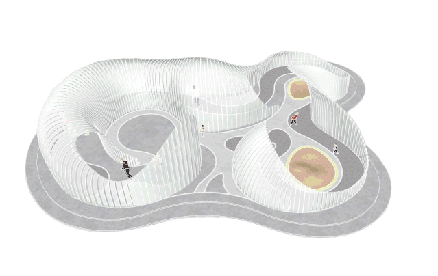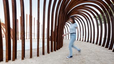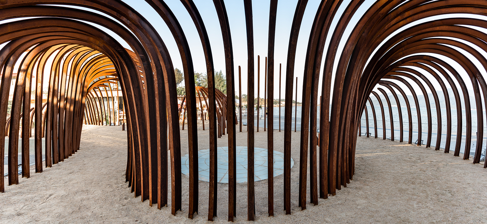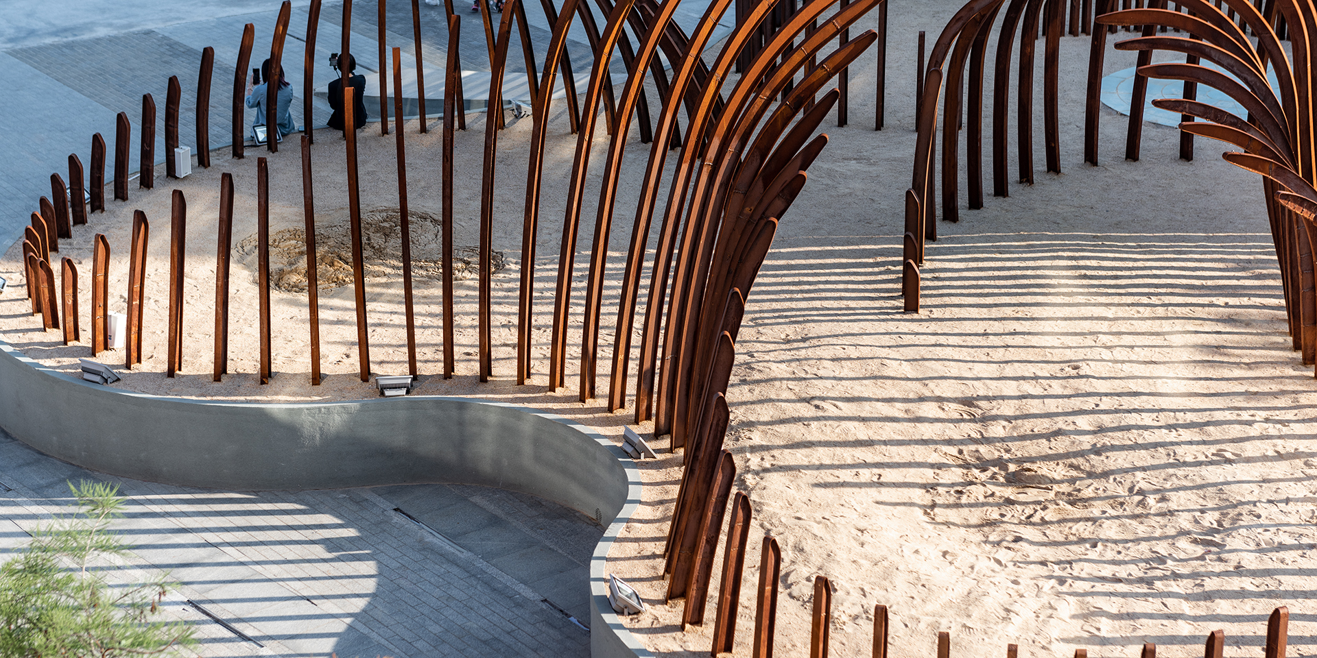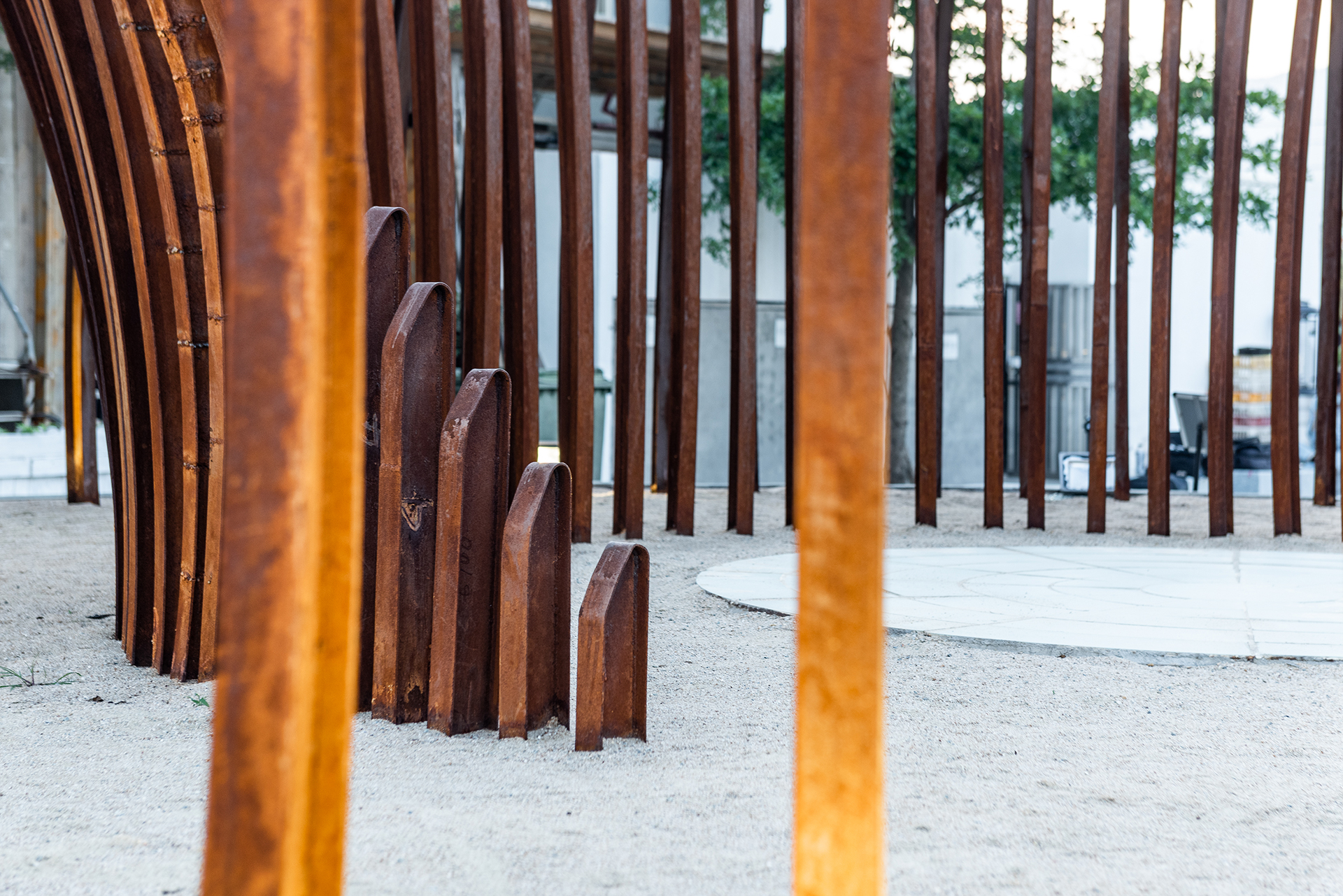 “海之韻”設(shè)計突顯了工業(yè)空間的特色:采用耐候鋼為整個裝置的造型主元素,外形輪廓模擬海浪沖刷形態(tài)。未經(jīng)修飾的耐候鋼龍骨,猶如航行百年,船身經(jīng)歷海浪侵蝕后殘留下的船架,斑駁銹跡,具有濃郁的歷史色彩。龍骨的匯集型線條引導(dǎo)觀眾進(jìn)入裝置內(nèi)部,耐候鋼與海沙形成了一個粗糙又統(tǒng)整的美感,歷史與生態(tài)的元素相互穿插,呼應(yīng)大鵬的海灘印象,同時形成了極具文化氛圍的展示空間。