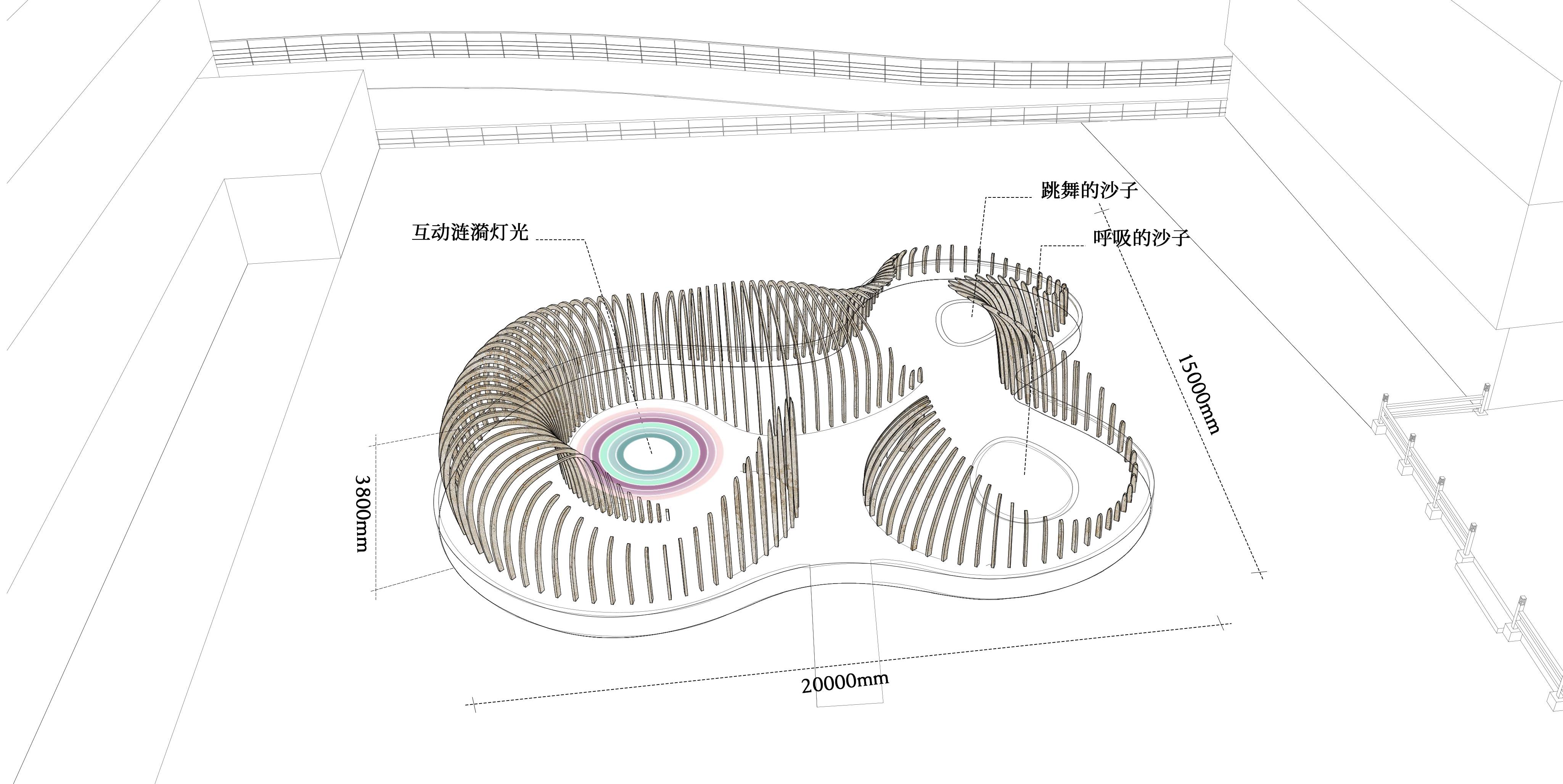 互動裝置“呼吸的沙”最初的靈感源自設(shè)計師兒時海邊抓螃蟹的記憶。海浪沖刷過沙灘,身形小巧的螃蟹在白色細(xì)沙下呼吸,沙面輕微起伏冒泡,留下了小小的印記。為了還原記憶,設(shè)計師通過藝術(shù)加工,讓沙子以生命呼吸的韻律進(jìn)行動態(tài)起伏。足下之沙,仿佛產(chǎn)生了流動的生命,讓參與者在不經(jīng)意中感受到大自然的魅力,同時引發(fā)對海洋環(huán)境的思考。