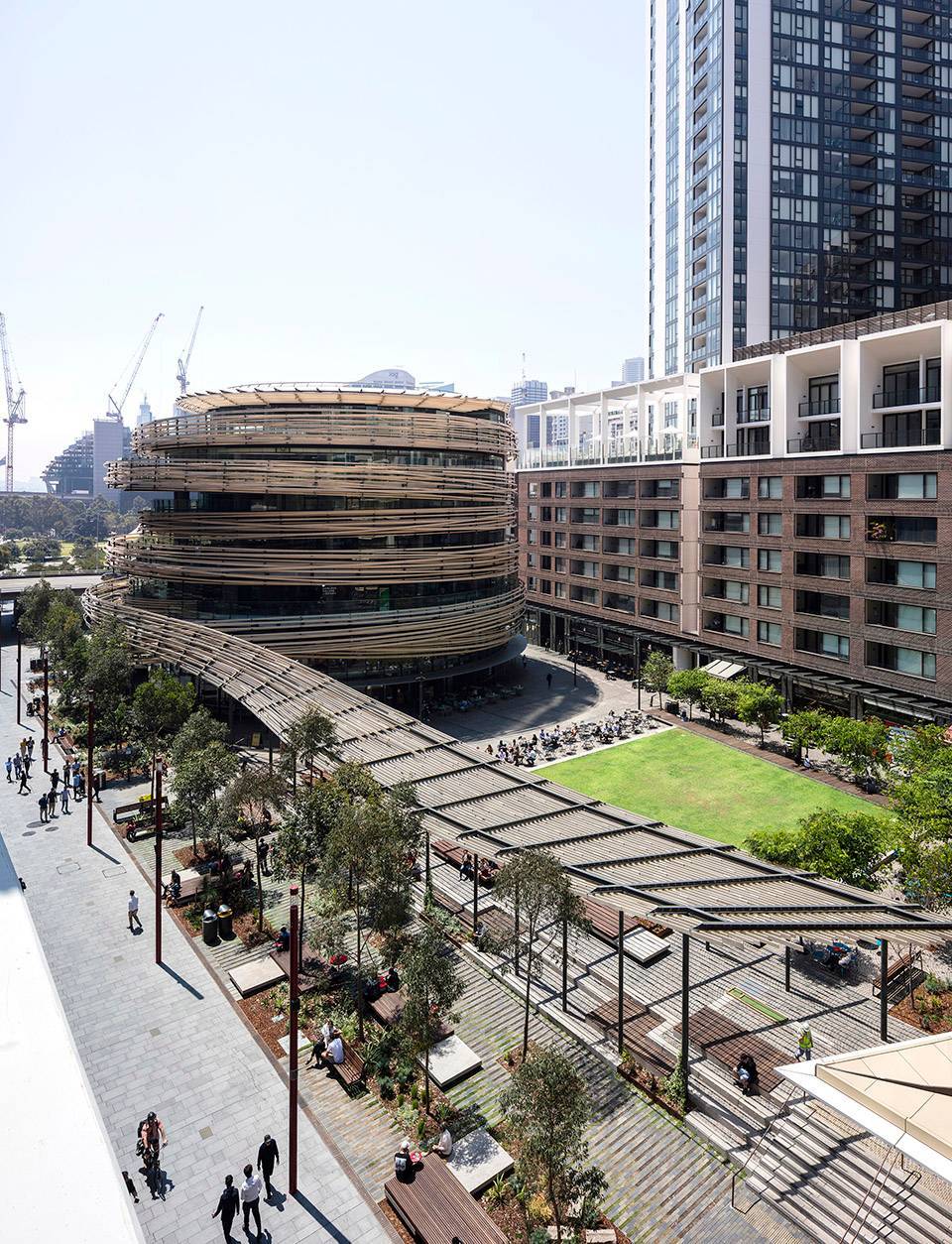 競賽之初,業(yè)主Lendlease曾提出,希望項目主體地標建筑The Exchange能給人帶來兼具多元社區(qū)和公共使用的功能。ASPECT Studios提議,將建筑形式設計為圓形,即告別傳統(tǒng)的前后門概念,打破建筑與公共空間的邊界。這一具有設計互動意義的提議成為了后來隈研吾事務所進行建筑設計的一個基礎理念。受到悉尼郊區(qū)綠樹成蔭的景觀的啟發(fā),隈研吾將自然力量與建筑主體融為一體成為一個強有力的符號。鏤空螺旋上升的建筑立面由20公里長的有機木材包裹,并在體塊和功能上自然延伸到公共空間,與周邊區(qū)域完美融合成為達令廣場的中心和目的地。