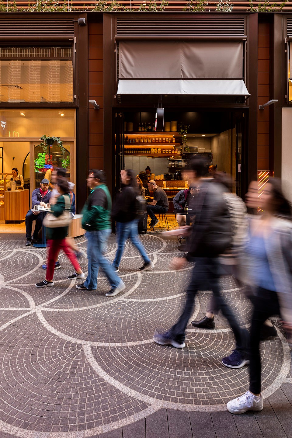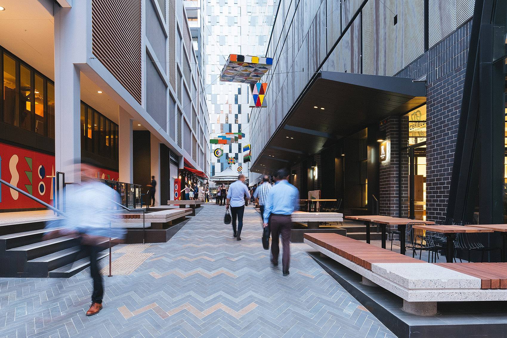 ASPECT Studios與Lendlease、Leon Paroissien 一起聯(lián)合為巷道的公共藝術和照明的設計提供了指導方向。最終,Steam Mill 步巷選擇了藝術家Peta Kruger的方案、Little Hay 街區(qū)中選方案為藝術家Brendan Van Hek的設計——兩條風格不同但熙熙攘攘的巷道,將人流吸引至達令廣場的中心。獨特的照明藝術裝置在巷道上方創(chuàng)造了愉快的氛圍,除了導視作用外,還激活了夜間場地活力。