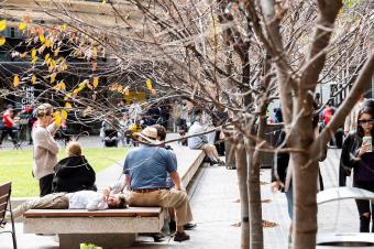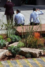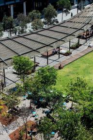 ASPECT Studios在廣場西側(cè)設計了一個帶有遮蓬的休憩外廊。在為廣場創(chuàng)造關鍵視覺落差的同時,也為人們提供了遮蔭和放松的場所。除此之外,遮蓬還創(chuàng)造了從建筑到廣場的視覺聯(lián)系,強調(diào)了兩者之間原本模糊的邊界連接。林蔭大道提供了色彩豐富的植被以及寬敞的座位供人們休憩。