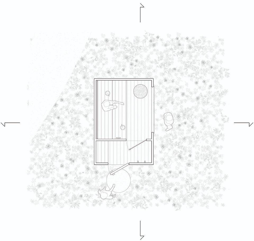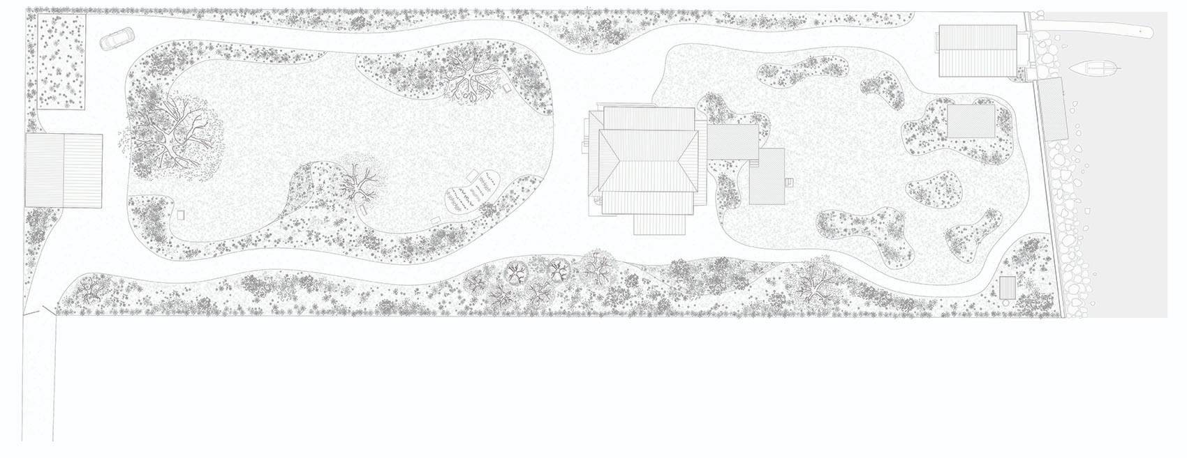 起初,設(shè)計團隊的任務(wù)是為場地設(shè)計一個花園。但在花園建設(shè)期間,設(shè)計團隊再次受到了委托,需改造巴雷特先生的住宅的小木屋。住宅建筑是組合型的垂直空間,呈現(xiàn)沉穩(wěn)的體量感,而花園則通植物的精心圍合,提供水平向的空間體驗,兩者形成一定程度上的空間對比?;▓@帶來了別樣的戶外體驗,是建筑與湖岸間的過渡。