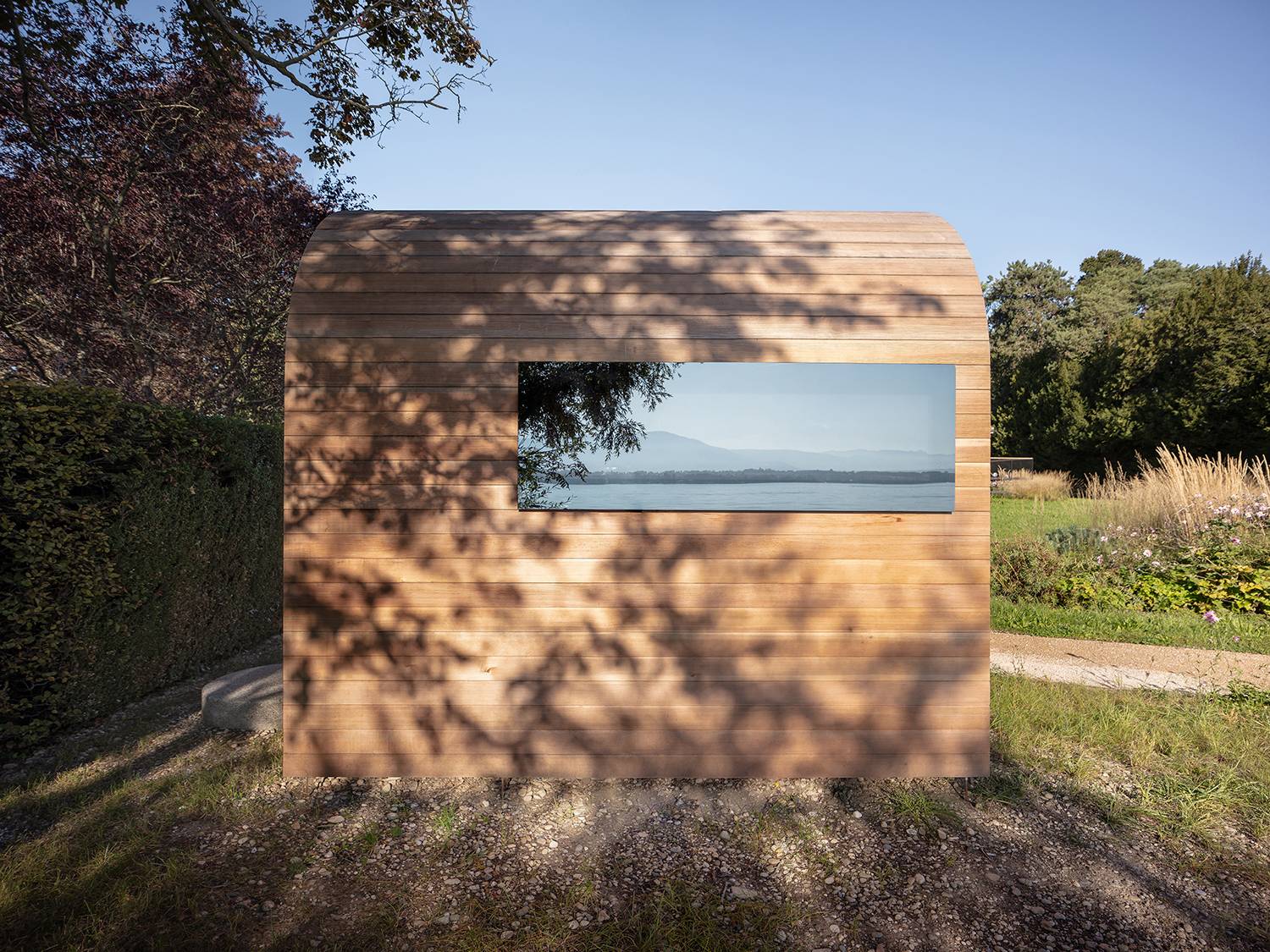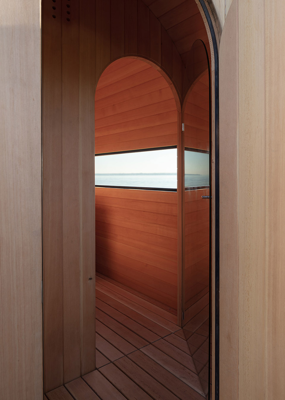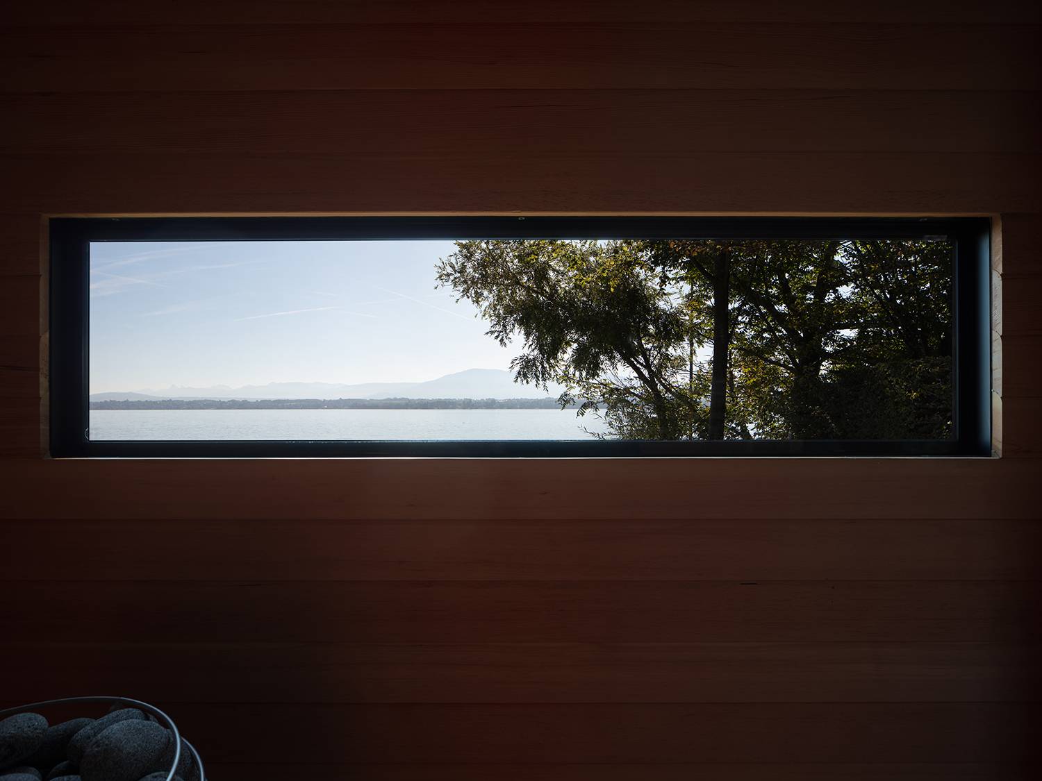 ▲桑拿房的窗戶上映照出湖景
