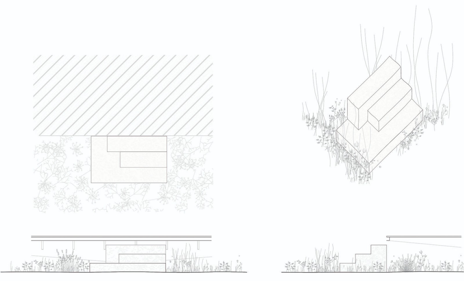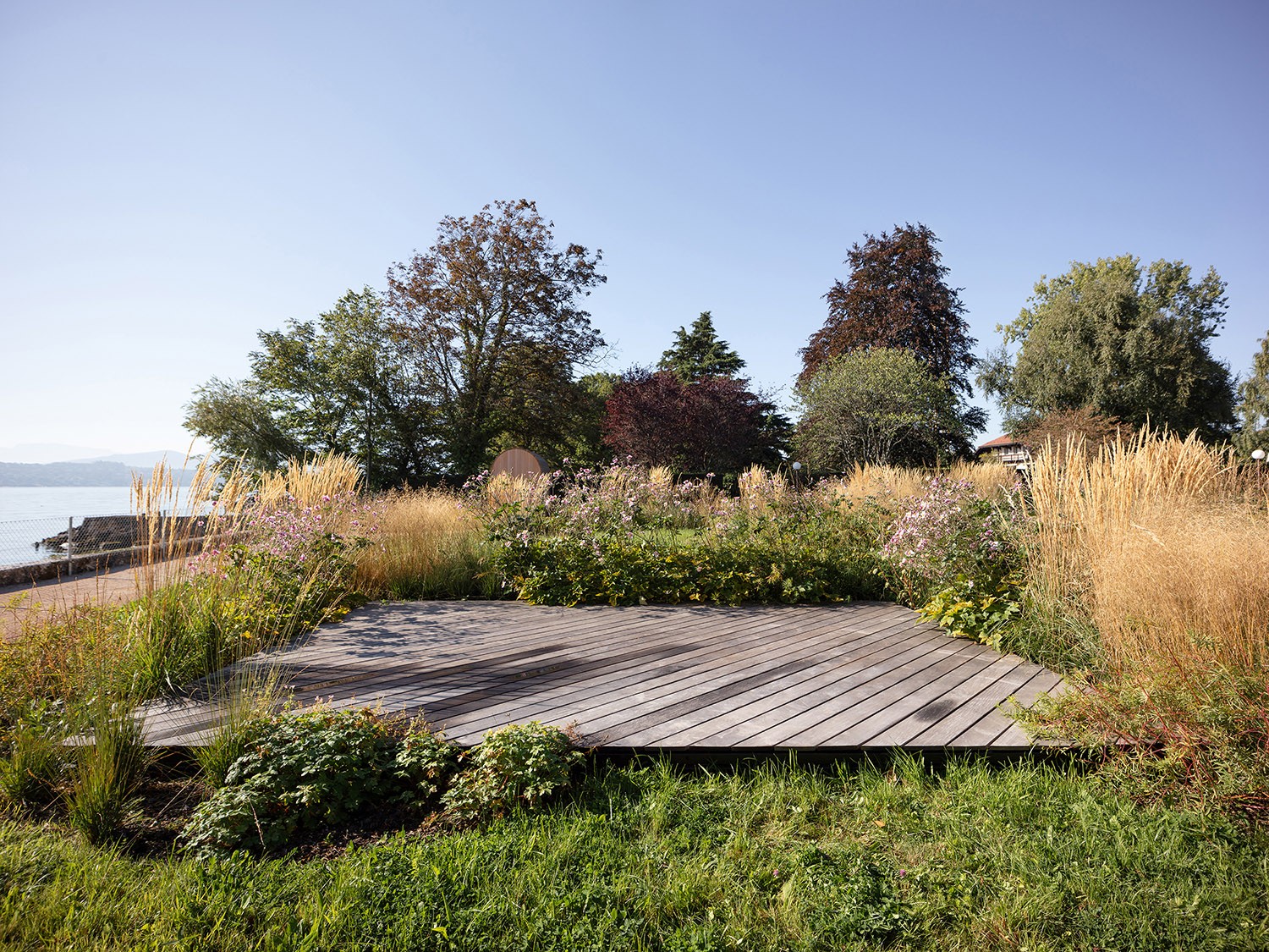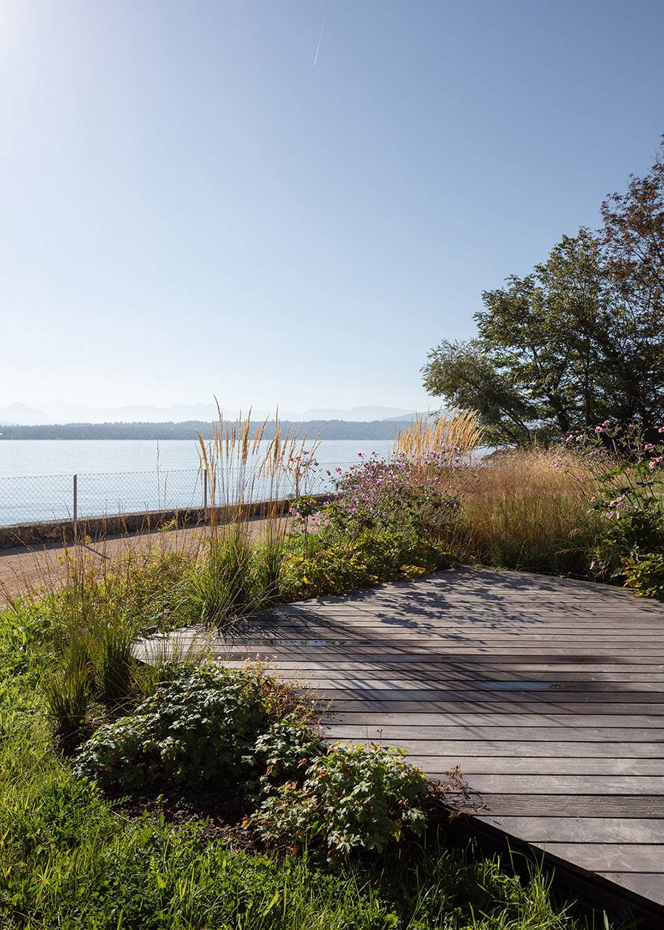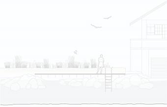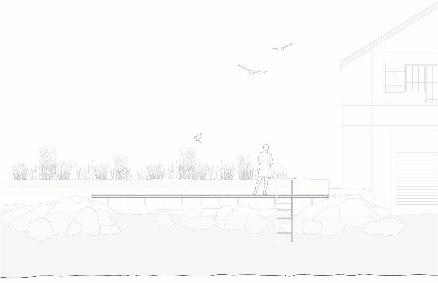 住宅樓主建筑坐落于兩側(cè)花園的中間,朝向東側(cè)花園。東側(cè)花園內(nèi)種植密度較低,使空間逐漸向湖岸廣闊的景色開敞。花園以一個親水平臺作為結(jié)束?;▓@的設(shè)計柔和了現(xiàn)有建筑(主建筑和小木屋)的體量感。