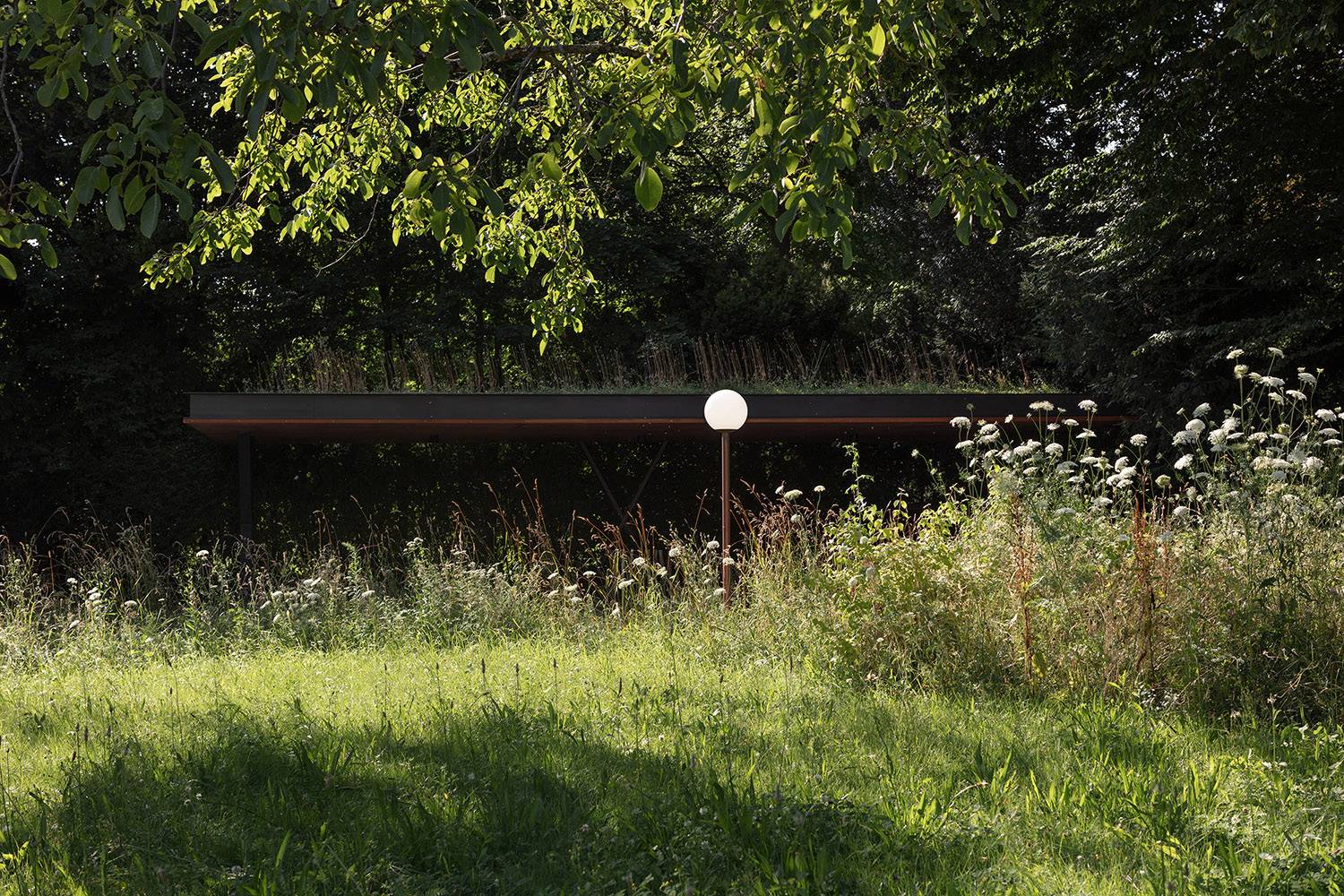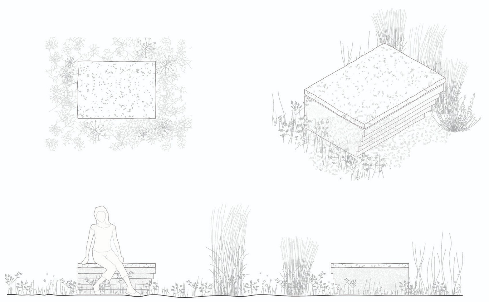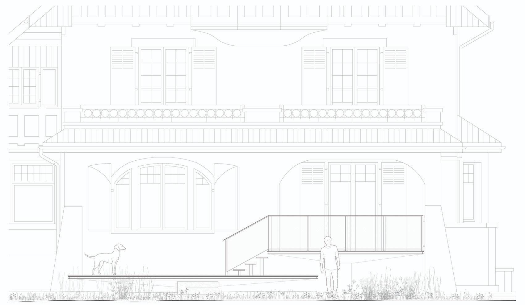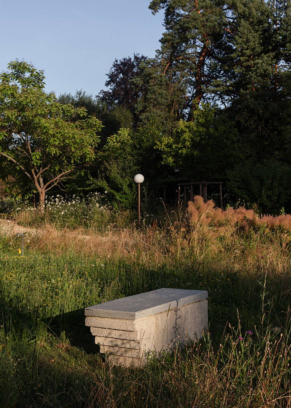 住宅樓主建筑坐落于兩側(cè)花園的中間,朝向東側(cè)花園。東側(cè)花園內(nèi)種植密度較低,使空間逐漸向湖岸廣闊的景色開敞。花園以一個親水平臺作為結(jié)束?;▓@的設(shè)計柔和了現(xiàn)有建筑(主建筑和小木屋)的體量感。