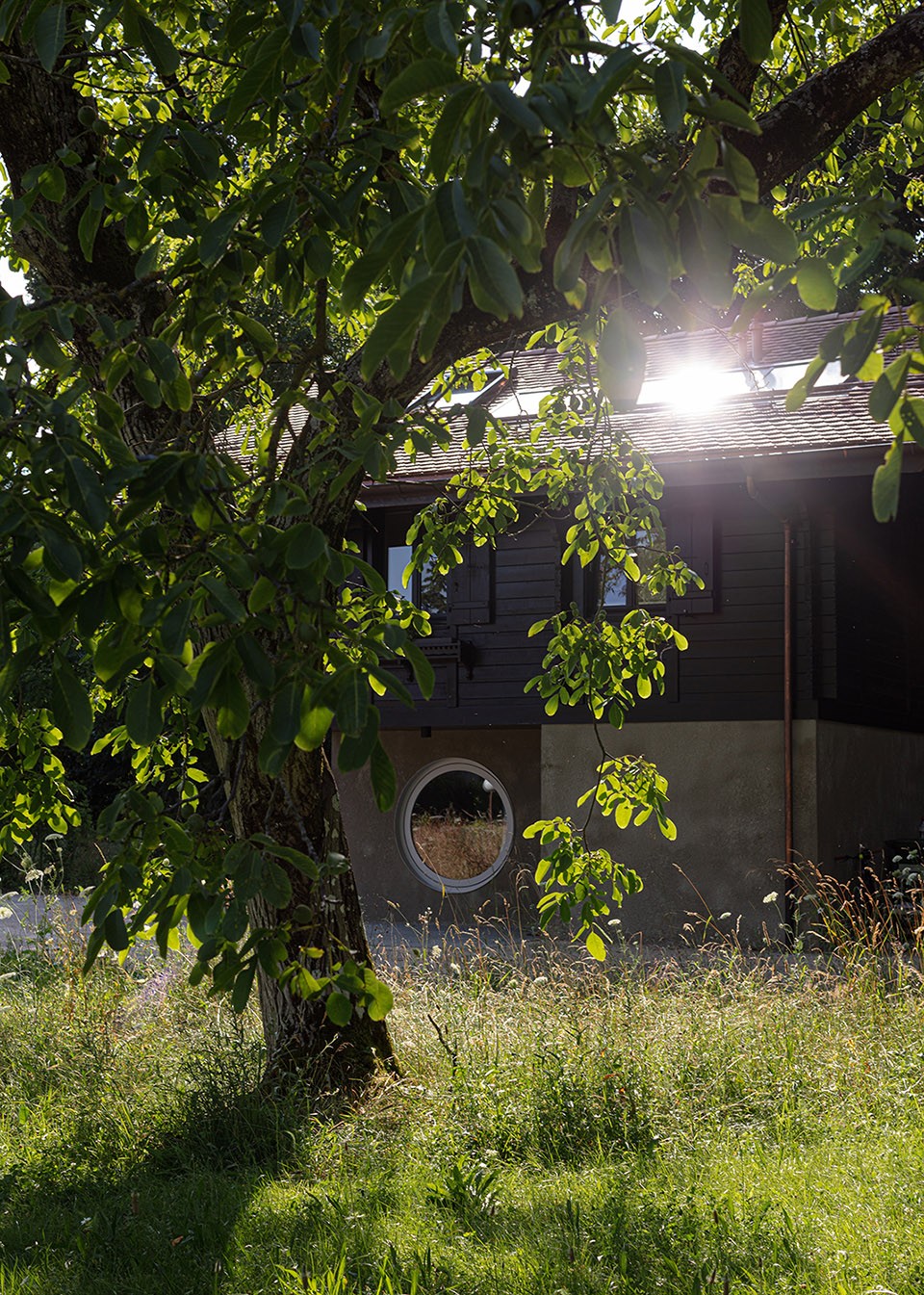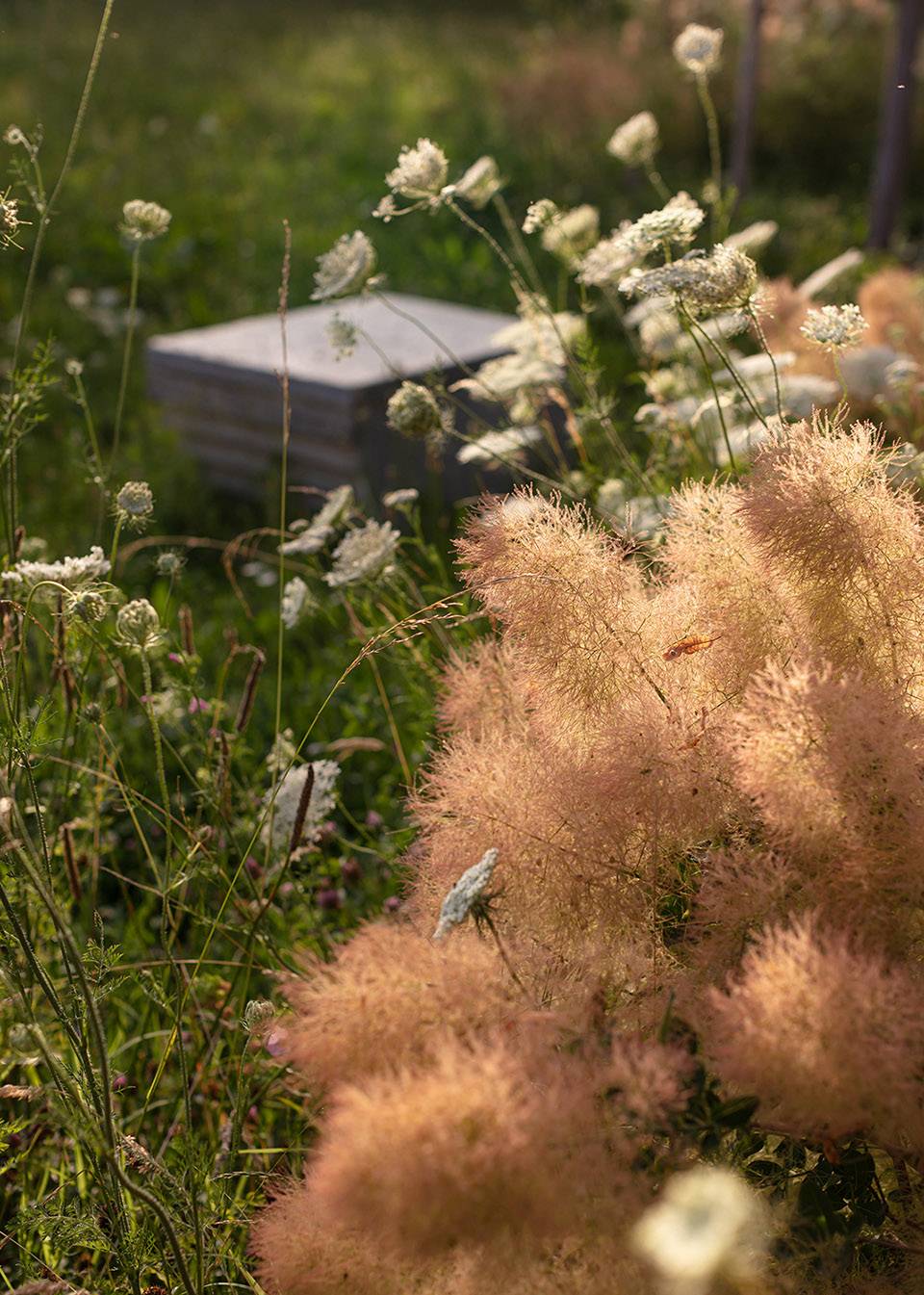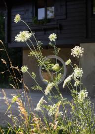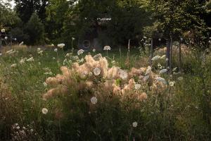 質(zhì)樸而具有本地特色的小木屋是整個場地開始,門前是西側(cè)的花園。西側(cè)的花園圍合感較強,主要空間留給了場地原有的核桃樹,僅在草坪上粗獷的種植了一些植被。設(shè)計師希望植物能隨著時間自由的生長,在場地中蔓延開來。