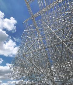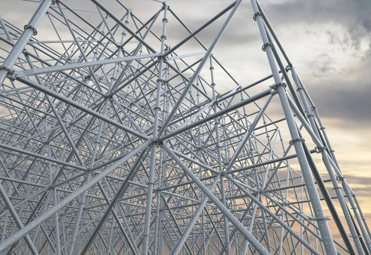 VL說,他在腳手架中看到了一種與材料本身的堅硬、牢固形成了強(qiáng)烈對比的透明感與視覺亮度。而鍍鋅鋼的光澤度在光線穿透和蒸發(fā)積聚方面也有著重要作用。該裝置在三角形和方形體塊之間達(dá)成了一種混合的平衡,它體積雖然龐大,但卻可以無限地回收再利用,易于儲存和運(yùn)輸。Vl甚至還設(shè)想創(chuàng)造一個人們可以從平臺上進(jìn)入其中的版本。