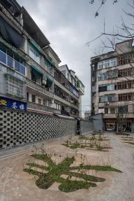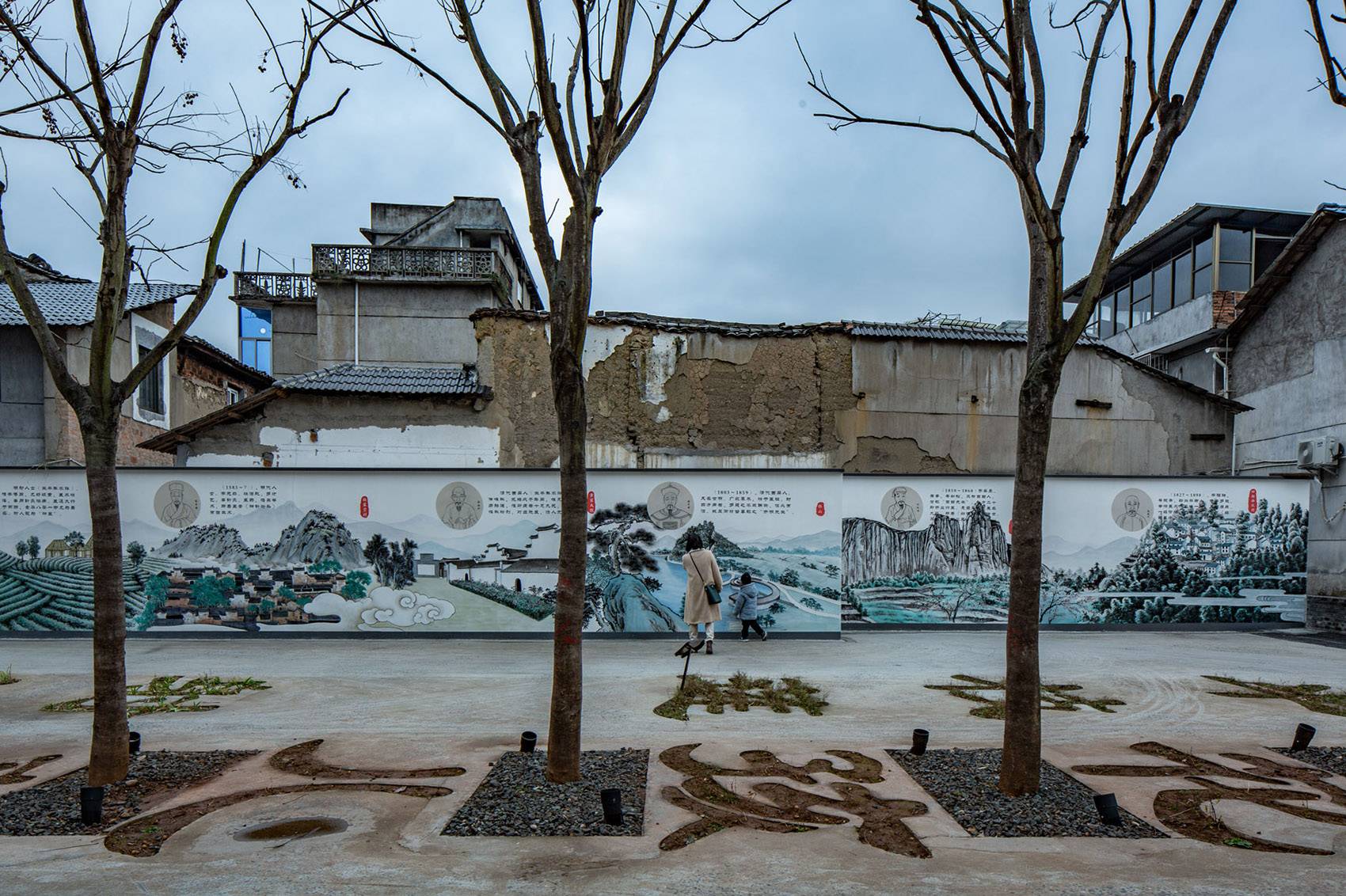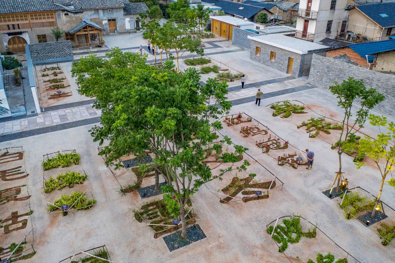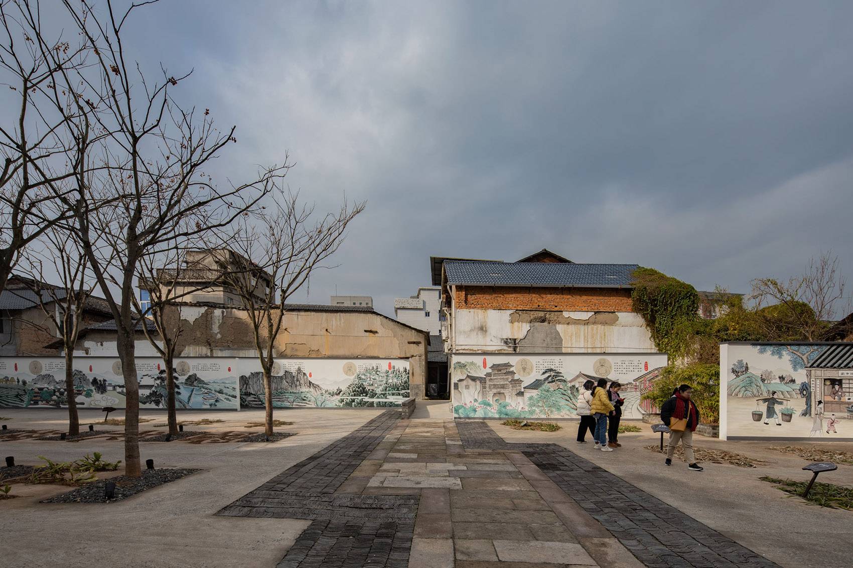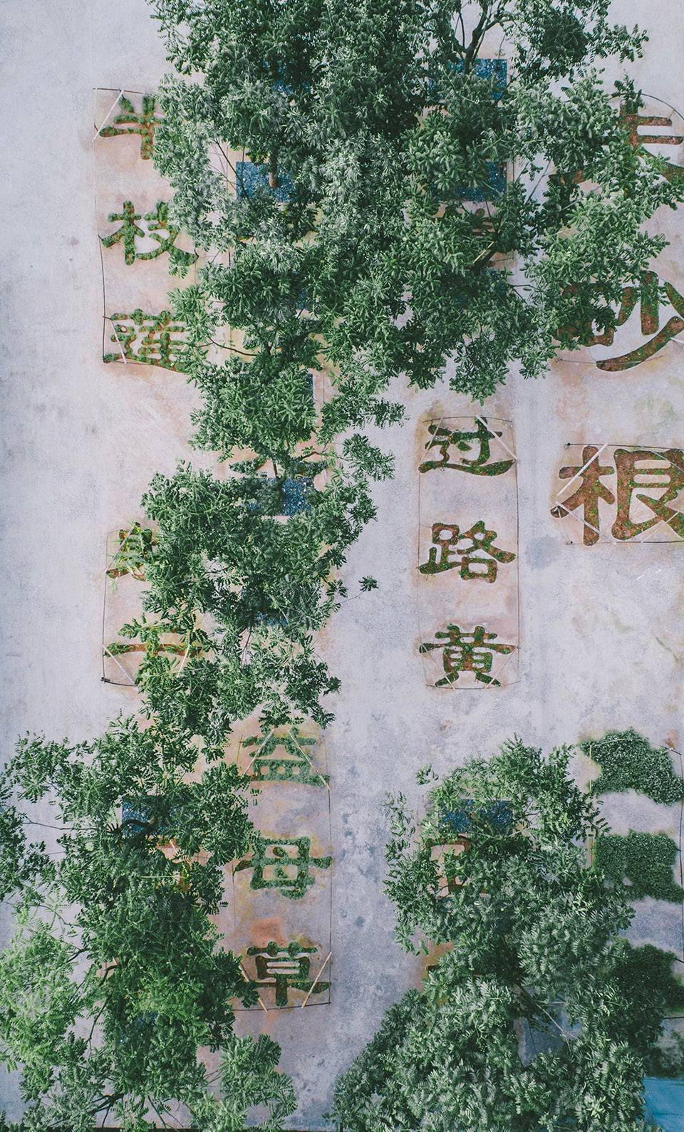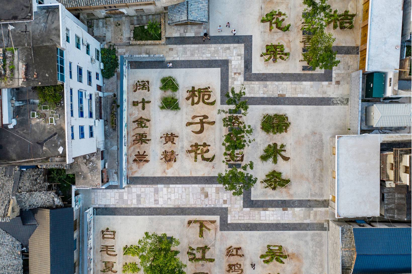 原有市場的地面已經(jīng)全部水泥硬化,那么設(shè)計(jì)則順勢而為,以硬化的水泥地面為底圖,開鑿地面種植藥材,以書寫方式記錄松陽當(dāng)?shù)靥赜械闹胁菟幤贩N,沿著南北進(jìn)深方向,分為春夏秋冬四個篇章,中間通過延續(xù)街區(qū)機(jī)理的東西向路徑區(qū)分。廣場四周以原有建筑圍合為主,西側(cè)新建的文化墻以傳統(tǒng)方式繪制松陽中醫(yī)藥文化歷史畫面,作為背景資料介紹,結(jié)合座椅提供停留休憩功能。