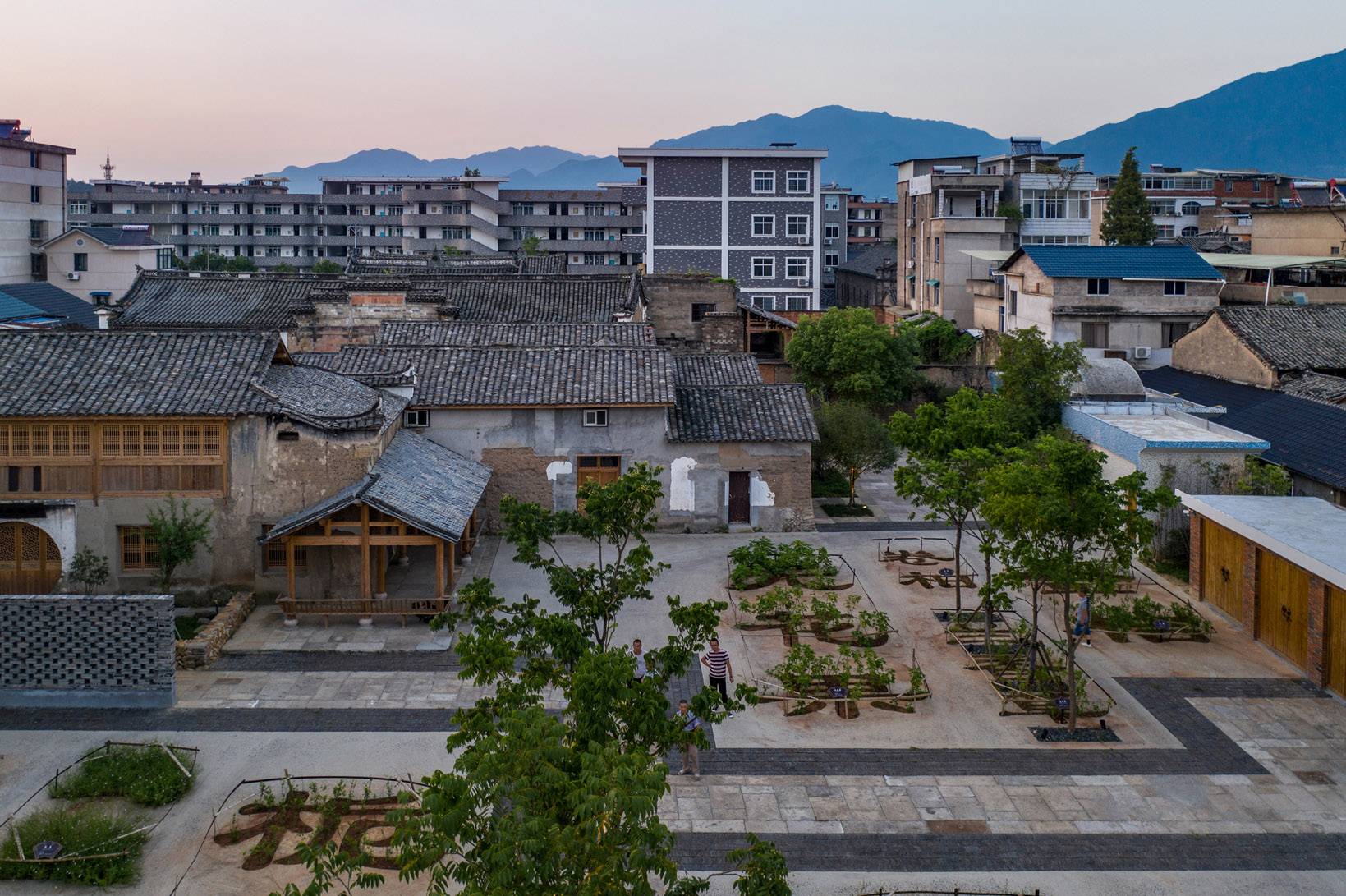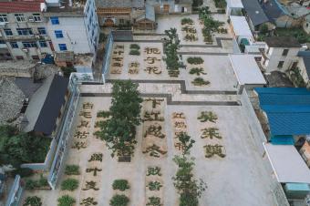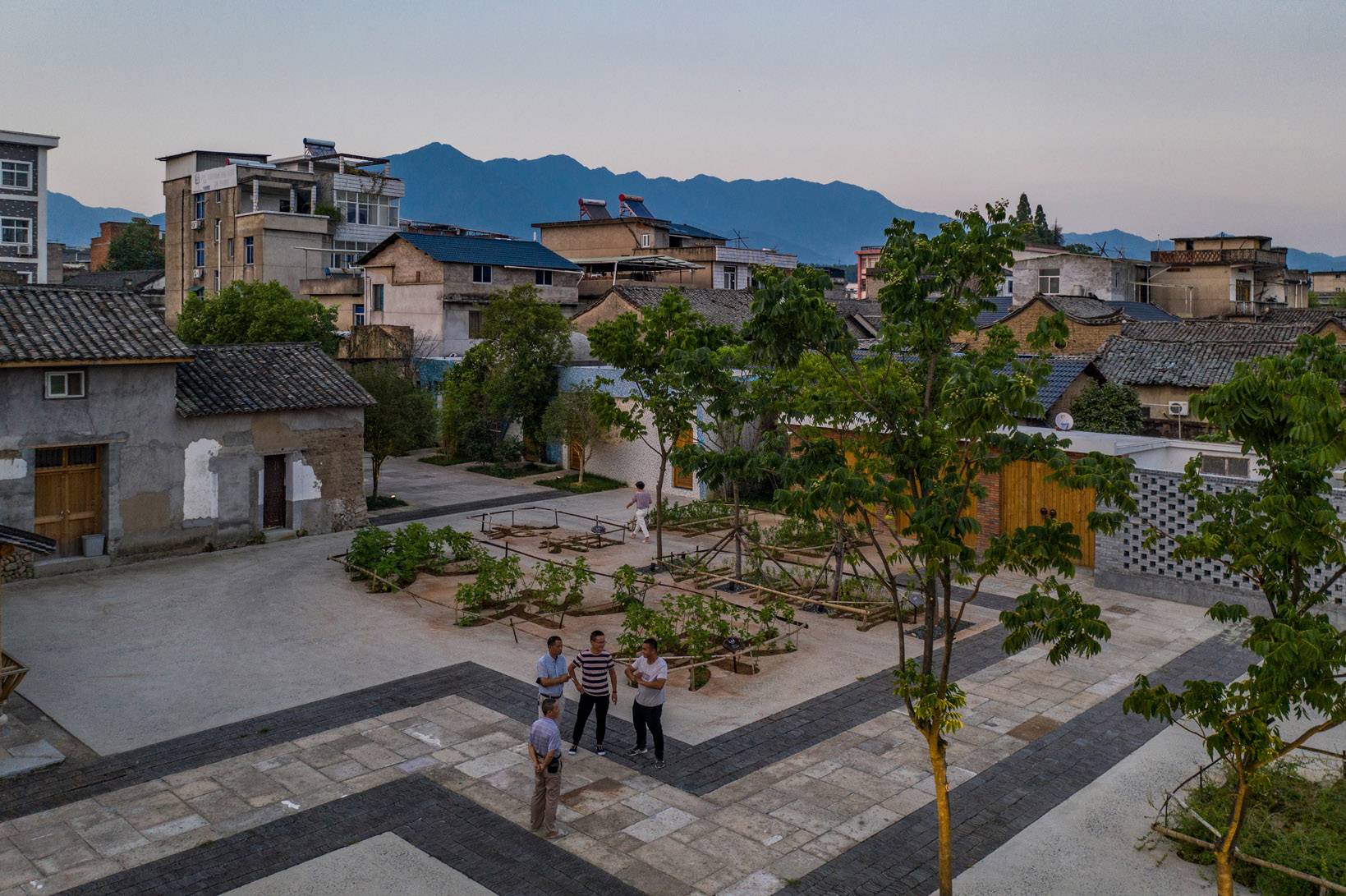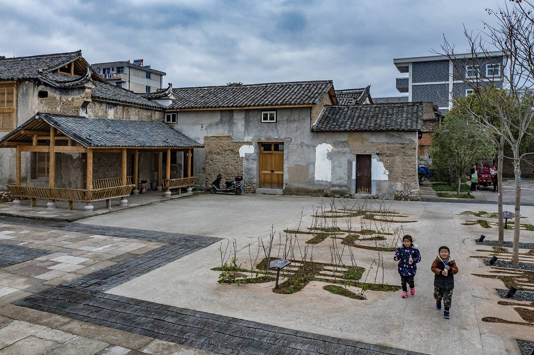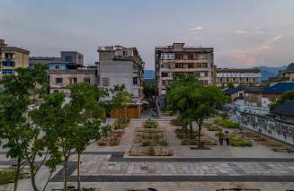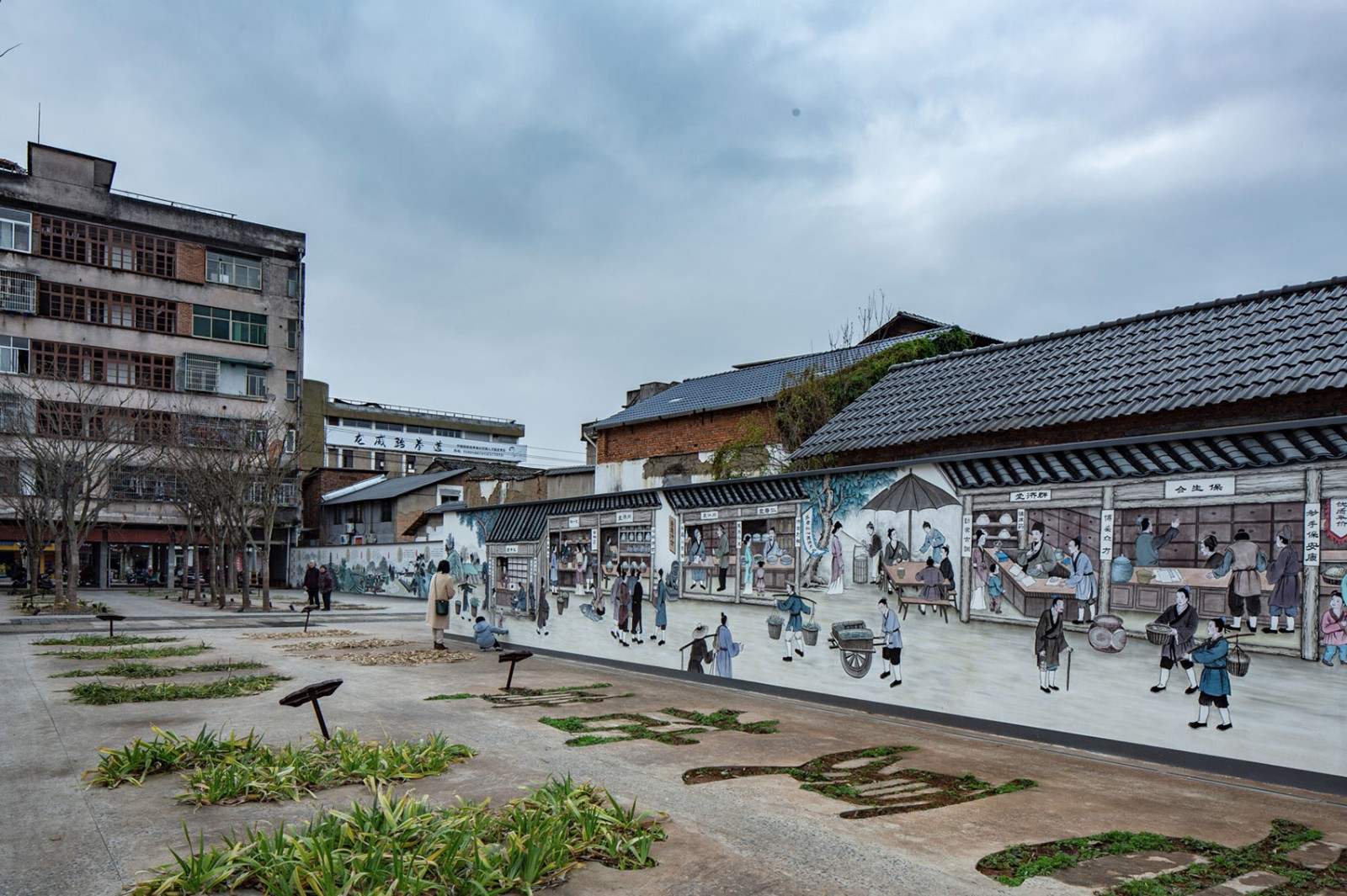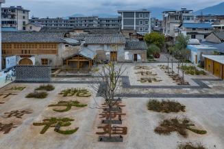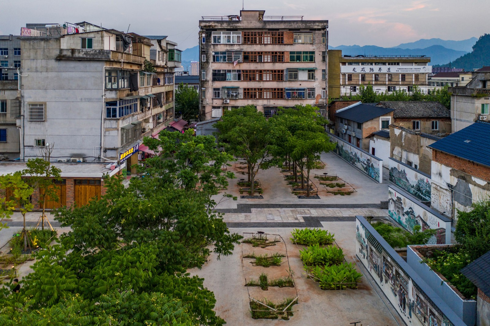 原有市場的地面已經(jīng)全部水泥硬化,那么設(shè)計(jì)則順勢而為,以硬化的水泥地面為底圖,開鑿地面種植藥材,以書寫方式記錄松陽當(dāng)?shù)靥赜械闹胁菟幤贩N,沿著南北進(jìn)深方向,分為春夏秋冬四個篇章,中間通過延續(xù)街區(qū)機(jī)理的東西向路徑區(qū)分。廣場四周以原有建筑圍合為主,西側(cè)新建的文化墻以傳統(tǒng)方式繪制松陽中醫(yī)藥文化歷史畫面,作為背景資料介紹,結(jié)合座椅提供停留休憩功能。