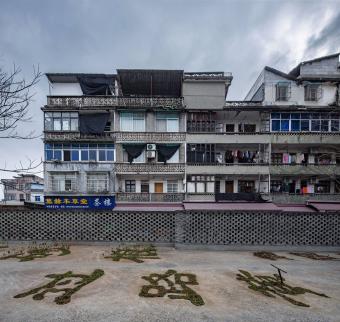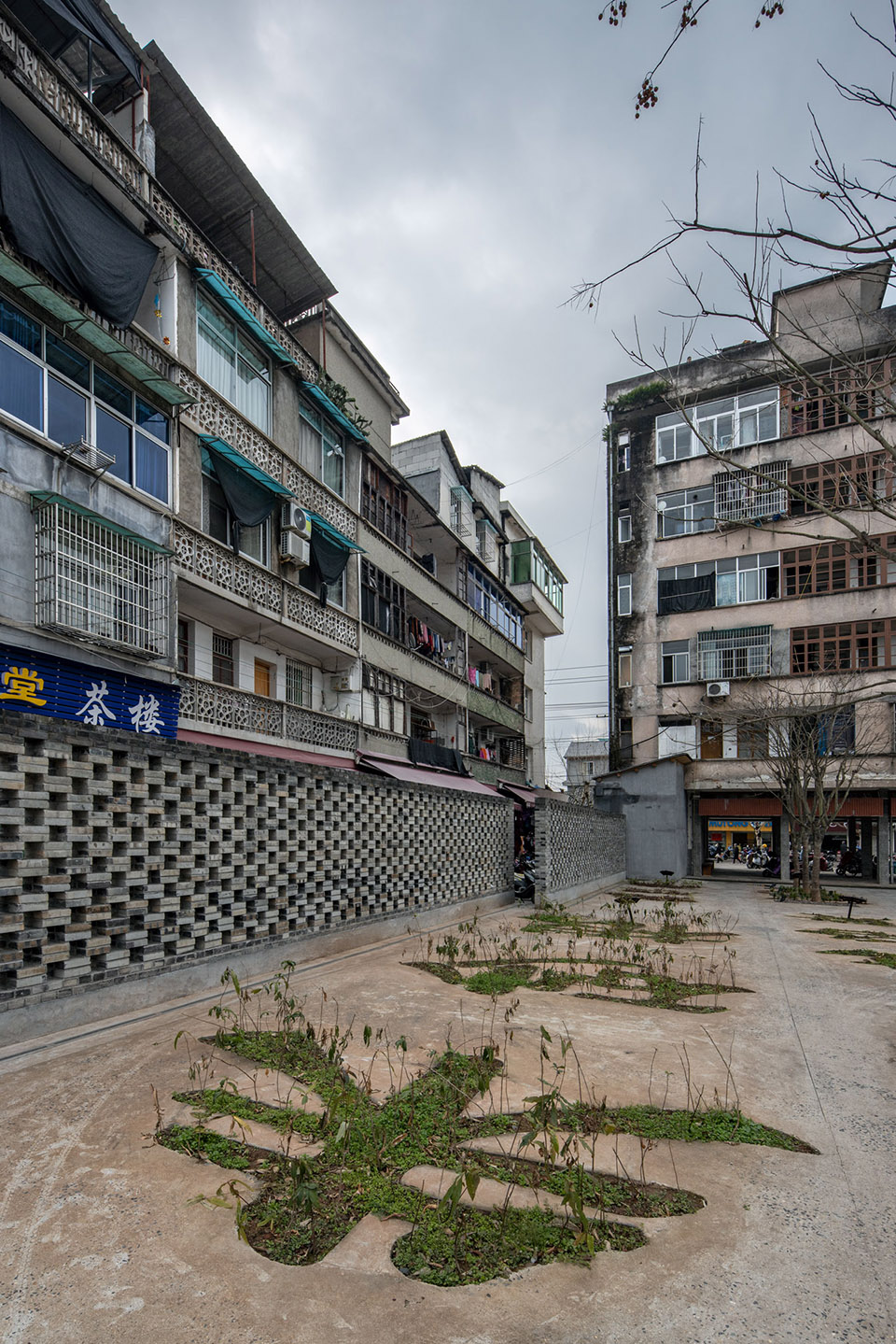 ▲廣場東側(cè)以鏤空磚墻與居民樓分隔