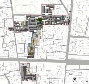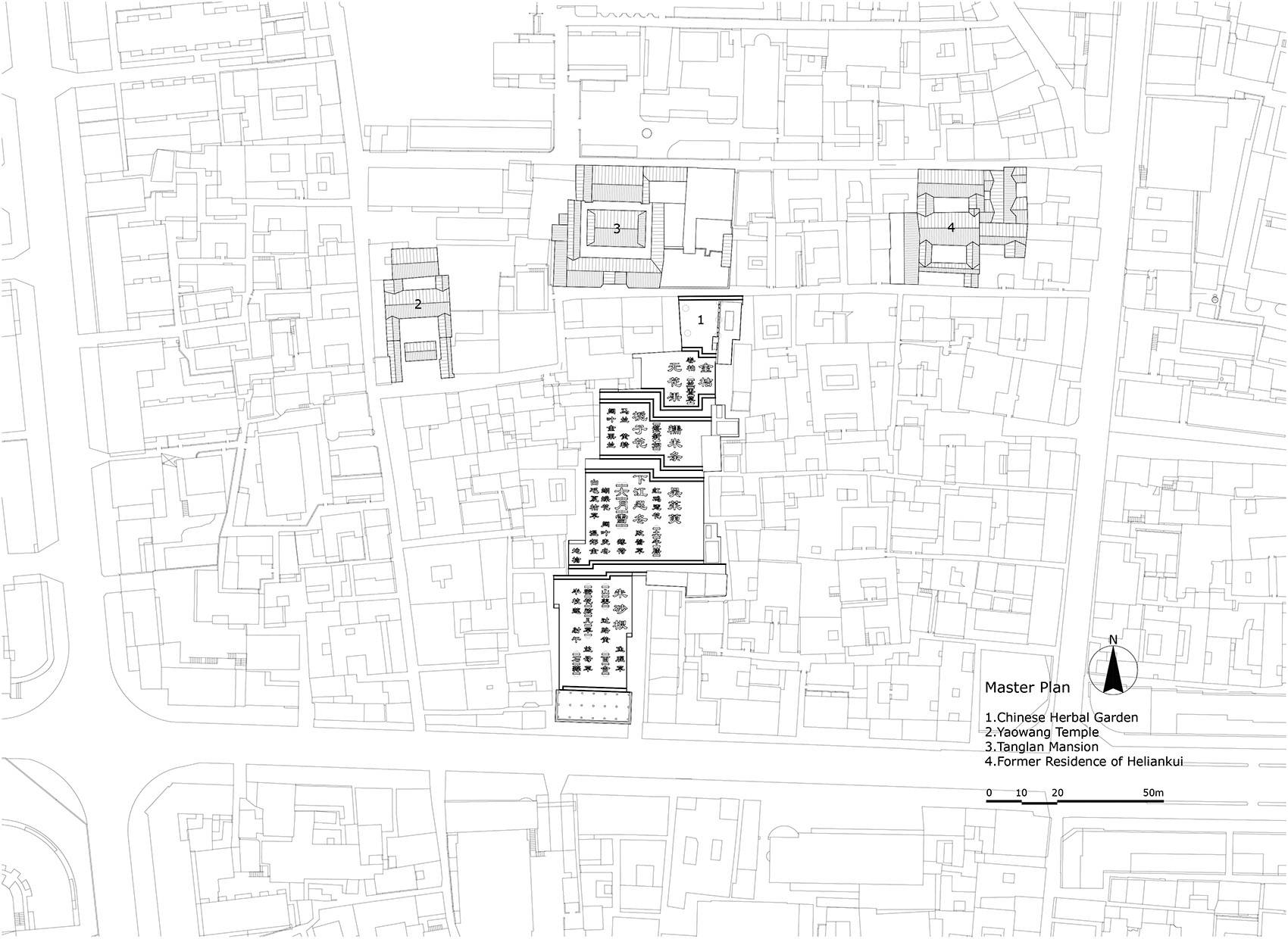 松陽中草藥資源豐富,中醫(yī)養(yǎng)生傳統(tǒng)文化底蘊(yùn)深厚。 縣城中心的歷史街區(qū)仍然保留完整的古城機(jī)理,文廟,武廟,城隍廟,藥皇宮,天后宮,太保殿等歷史文化建筑留存至今。其中以藥皇宮為中心的中醫(yī)藥康養(yǎng)文化街區(qū),規(guī)劃引入文創(chuàng)研發(fā)藥膳飲食傳承教學(xué)等功能業(yè)態(tài), 融合周邊居民生活區(qū)塊 。這片區(qū)域居民自住房屋密集,巷道狹窄 ,原有的小商品貿(mào)易市場,由輕鋼結(jié)構(gòu)搭建,給生活區(qū)帶來消防隱患,已經(jīng)騰退清空,規(guī)劃將此區(qū)塊和南面主要道路的太平坊路打通,形成貫通開敞的入口,和南面修繕中的松陽高腔戲院連接,并在密集的歷史街區(qū)中形成開放廣場,提供縣城居民日常生活休閑場所。