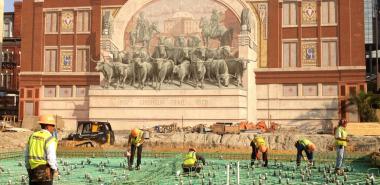 最初,場地中的土壤對結構支撐、排水和植物健康均造成了阻礙。既有的石灰?guī)r黏土缺乏清晰的輪廓,景觀設計師必須與結構工程師、城市土壤專家和園藝師組成的團隊進行密切合作,以便為場地的宏觀發(fā)展做好準備。廣場巨大的人流量需要依賴堅固耐用的支撐系統(tǒng),并且還要具備處承載和運行大型卡車和服務車輛的能力。經過緊鑼密鼓的設計和協(xié)調工作,數(shù)個堅固的系統(tǒng)最終被建立起來,為廣場上復雜的鋪裝、噴泉管道以及埋在地下的植物根基提供了保護。