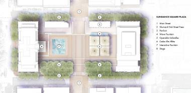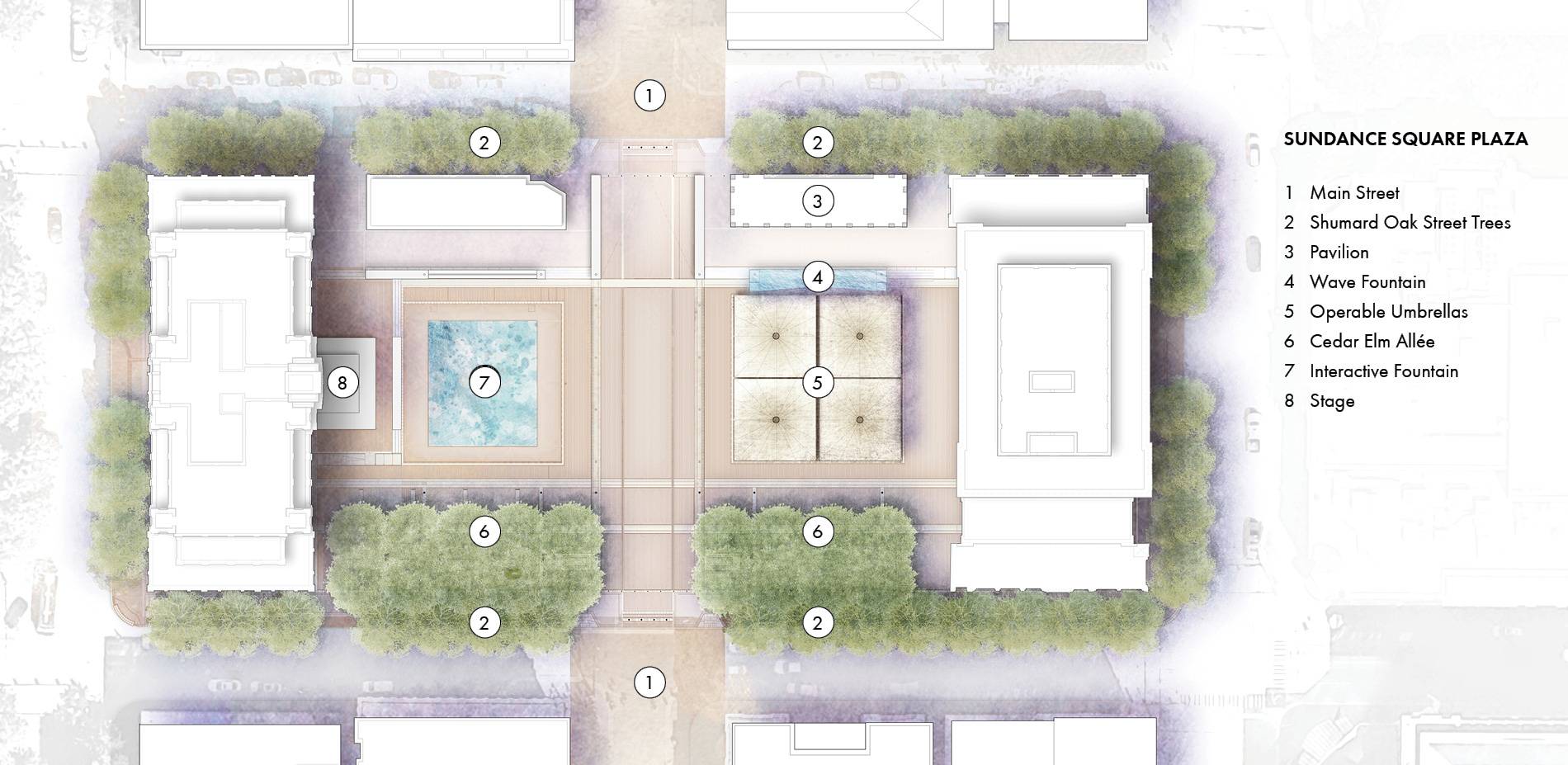 ▲圣丹斯廣場平面圖:廣場位于市區(qū)中心,打斷了沃思堡的主街長廊。廣場服務于所有重要的城市活動。