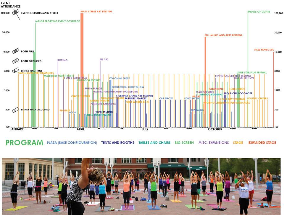 景觀設計師與客戶及城市規(guī)劃師進行了緊密合作,旨在滿足預期的日常和季節(jié)性活動需求。廣場每月都要舉辦十場免費公共活動,包括節(jié)日慶典、游行、音樂會、瑜伽教學和電影之夜等等。這些活動激活了城市的多元化人群——景觀建筑基金會的調查顯示,絕大多數(shù)居民都認為廣場改善了他們對城市的印象,同時增強了認同感。