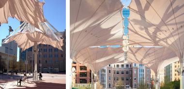 廣場上的可調節(jié)遮陽傘無疑是最能體現(xiàn)該設計要求的地標式元素,這是一項里程碑式的設計,在全美國也實屬首次。這一組遮陽傘高達32英尺(約9.75米),跨度為40×40英尺(約12米),帶來總面積為6400平方英尺(約594.6平方米)的陰涼區(qū)域,同時讓中午的路面溫度降低了約5.5攝氏度。根據(jù)反饋,游客們常常會在清晨觀看防水布從伸縮式桅桿上展開的過程;在涼爽的天氣里,遮陽傘則會被收起,讓陽光充分地溫暖地面。在夜晚,遮陽傘上的LED燈會發(fā)出多彩的光線,為整個廣場帶來一場絢麗的燈光表演。